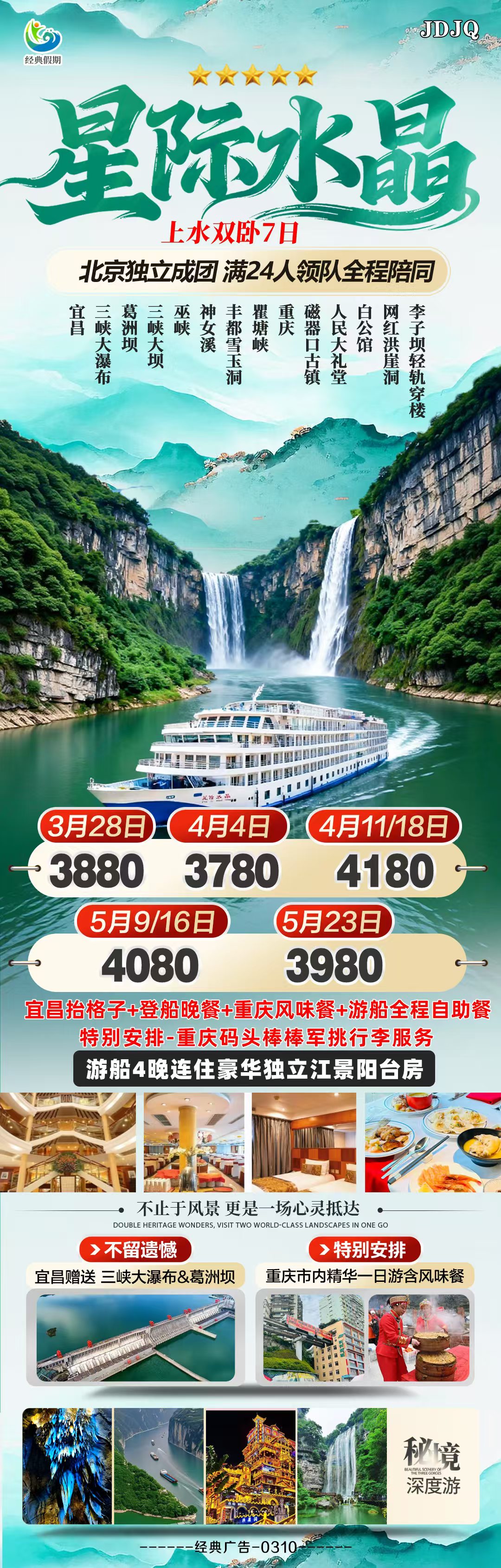 [p]【住宿】:星际水晶号涉外五星豪华游船,双人阳台标准间4晚连住(独立阳台、中央空调、彩电、24小时热水 独立卫生间)(我公司不提供自然单间,单男单女可与游船上其他同性别男/女拼房合住,无需补单房差,如不愿意拼房。则需出发前补齐单间房差) [br] [/p] [p]【用餐】: 4早9正(4早6正游船统一安排:全程自助餐,团队用餐不用不退费用,请知晓) [br] [/p] [p]宜昌赠送中餐特色餐抬格子+登船晚餐,重庆赠送中餐特色餐重庆风味餐 [br] [/p] [p]【景点】:以上景区首道大门票(三峡大坝、神女溪、丰都雪玉洞) [br] [/p] [p]【用车】:根据人数安排车型 保证每人一个正座,接送火车为小车或者商务车,北京往返空调火车硬卧 [br] [/p] [p]【导游】:游船中英文船陪服务,陆地分段优秀导游,北京起止全陪导游 [br] [/p] [p]【保险】:旅行社责任险,建议客人自行购物旅游意外险 [br] [/p] [p]【小费】:游船小费已经包含 [br] [/p]【购物】:全程纯玩无购物,景区中公共购物场所,不属于我社安排的购物店,请慎重购买