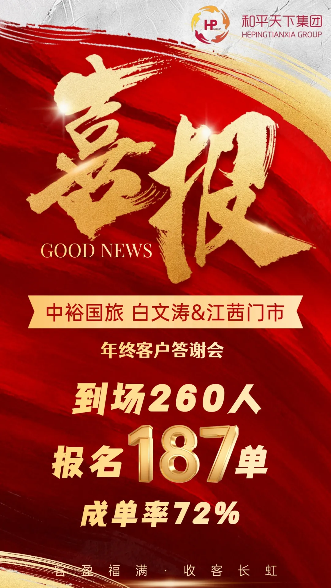 在答谢会现场,我们向客户表达了深深的感谢,他们一直以来对我们工作的支持和信任,是我们不断前行的动力。也要感谢我们合作伙伴们的鼎力相助,让我们能够提供更丰富、更优质的旅游产品,满足广大旅客的需求,分享了旅游行业的最新动态和市场趋势,期待在未来的日子里,能够继续携手合作,共创辉煌。