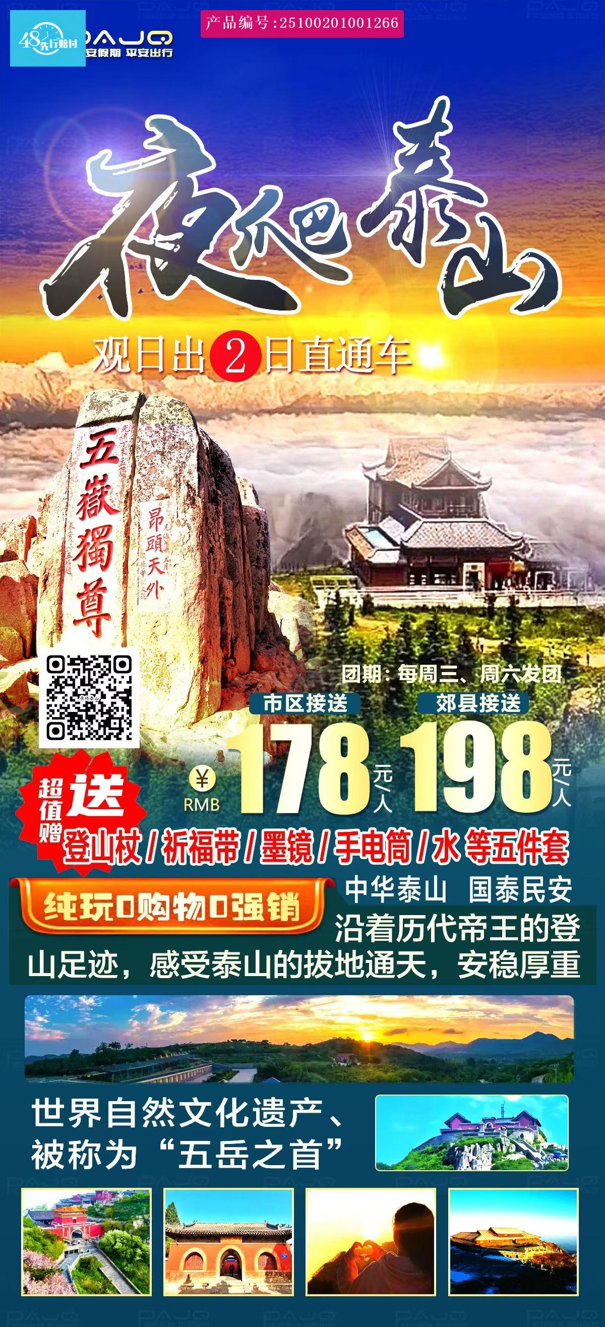 [p]指定时间集合登车出发赴世界自热文化遗产、被称为“五岳之首”的泰山(路程约400公里左右), [br] [/p] [p]国旅钉子:抵达后,自行安排晚餐,随后由红门步行上山,开启夜爬泰山模式 [br] [/p] [p]国旅钉子:,依次经过:红门、万仙楼、斗母宫、观音殿、中山门、迎客松、对松山、十八盘、南天门、天街、青帝宫、五岳独尊石刻处、无字碑、日观峰、玉皇顶(泰山最高峰,海拔1545米)。体验“会当凌绝顶,一览众山小”,感悟泰山世界文化与自然双遗产的独特魅力,沿着历代帝王的登山足迹,感受泰山的拔地通天,安稳厚重! [br] [/p] [p]温馨提示:登泰山没有走过这条路,不能算是真正意义上游览过泰山,初次登泰山者强烈推荐。 全程攀登需要一定的体力和毅力,对此,在登山之前要有一定的思想准备。如登山途中感觉体力不支,可在徒步到达中天门后,换乘索道直达岱顶。祝福大家勇攀高峰!! [br] [/p] [p]国旅钉子:夜爬泰山山上气温较低,一定携带后衣服。建议携带食物补充体力如:面包、红牛、巧克力等以及辅助工具如手电筒、手套等。登顶后建议大家看好时间选择最佳地点观看日出。(观看日出根据当地天气决定,若天气不可抗力因素无法观看日出,旅行社不做任何赔偿) [br] [/p] [p]2 [br] [/p] [p]第二天 [br] [/p] [p] [br] [/p]
