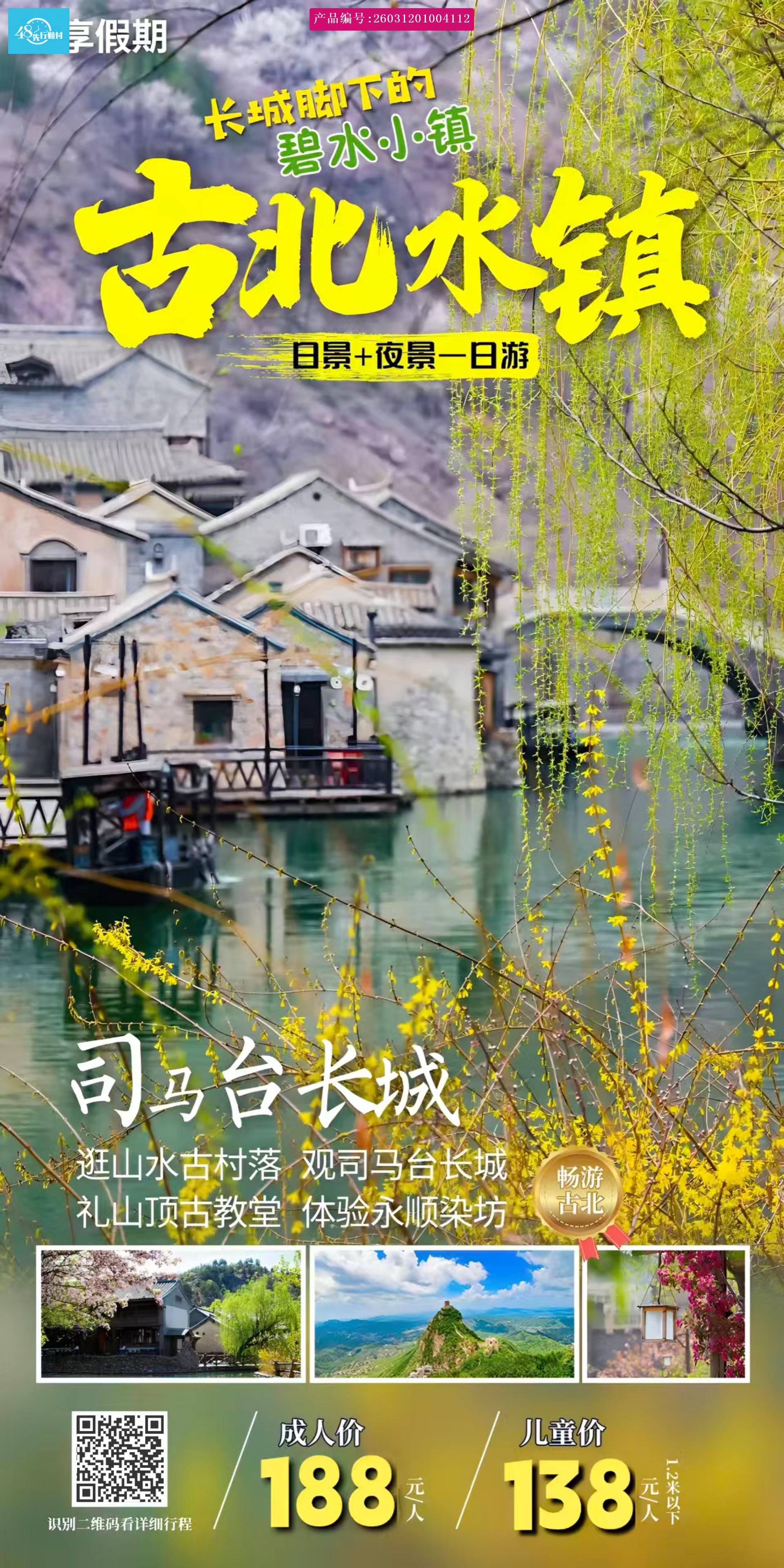 早指定地点集合乘车赴北京密云古北水镇国际旅游度假区。抵达后大家自行探索游览集山、水、城完美结合的古北水镇。水镇在鸳鸯湖畔、司马台长城脚下。群山围绕、潺潺流水迂回曲转,更有质朴的木屋、房舍和周围环境融为一体···指定时间集合,乘车返回温馨的家。 [p]景点介绍 [br] [/p] [p]古北水镇景区:位于密云县,背靠司马台长城,坐拥鸳鸯湖水库,悠悠水巷是古北水镇的一大亮点。古朴、典雅、风景如画、鳞次栉比的房屋,青石板的老街,悠长的胡同,水镇内河道密布,其现存的“司马台古堡”是北京市重点文物保护单位,“长城+古镇”是罕见的雄伟自然、文化景观混合在一起的历史人文风景区。 [br] [/p] [p]可以亲自参与老北京的传统文化(免费教学,材料费自理),亲手制作剪纸、风筝、灯笼、绘制球鞋、扎染等特色手工艺,给自己这份旅行留一片独特的记忆。感受北方乌镇,无需下江南—就在古北水镇! [br] [/p] [p]表演:传统演绎-相声快板、评剧、杨家将铁板书、民间杂技杂耍表演、京剧、京东大鼓、满足摔跤,皮影戏等 [br] [/p] [p]游览:游客服务中心-司马小烧-永顺染坊-汤市街-英华书院-杨无敌祠-镇远镖局-八旗会馆-水镇食街-汤市街。 [br] [/p] [p](以景区当天节目安排为准) [br] [/p] [p]司马台长城(门票自理):是我国唯一一处保留明代原貌的长城,整个长城城墙依险峻山势而筑,以奇、特、险著称于世,保存有完整的20 座敌楼,尤其望京楼筑于海拔千米的陡峭峰顶,景观绝佳,可遥望到北京城。被联合国教科文组织确定为“原始长城”。英国的泰晤士报 2012 年曾将司马台长城译为“全球不容错过的 25 处风景之首”。登望京楼台,遥看北京城,听长城故事,享碧水蓝天 [br] [/p]