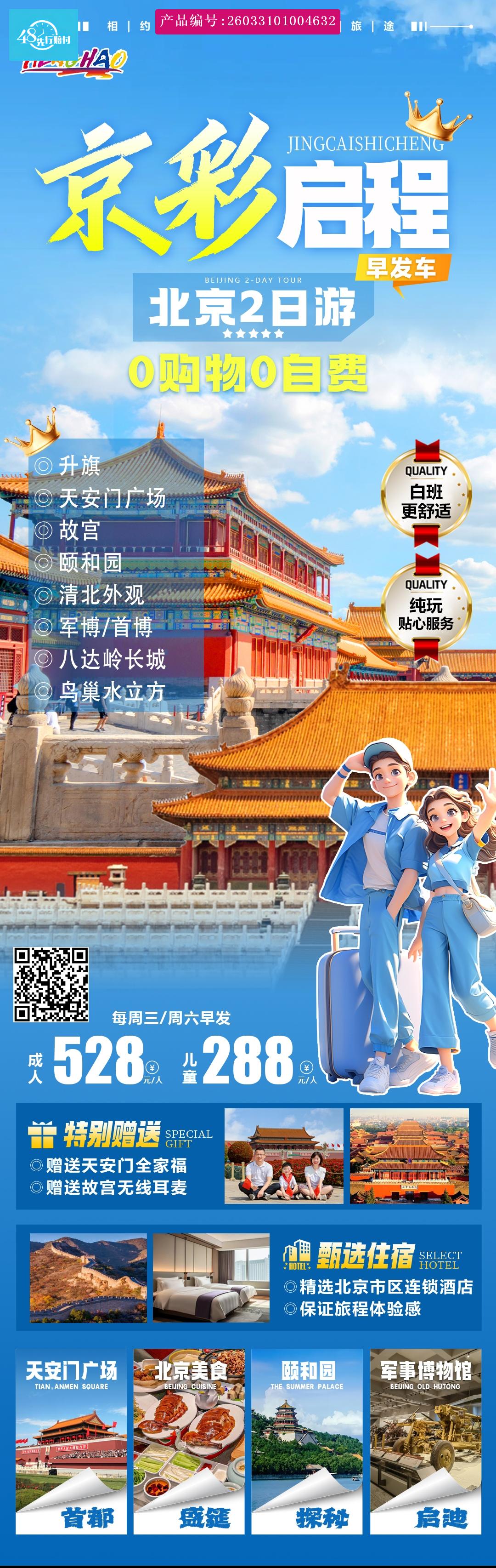 早指定地点集合后乘坐空调旅游大巴车前往首都北京,抵达后前往参观全国中小学生研学实践教育基地【中国人民革命军事博物馆】是中国唯一的综合类军事博物馆。馆藏文物以反映中国人民解放军军事史、中国古近代军事史和世界军事史为主。馆藏特色文物为武器、军服、证章和军事题材艺术品等。现有文物18万余件套,一级品1793件套。目前开放区展出的有王海在抗美援朝战争中驾驶过的米格-15歼击机、开国大阅兵的领头战机——P-51战斗机、我军的第一辆坦克“功臣号”、珍宝岛自卫反击战中缴获的T-62坦克、美制U-2高空侦察机残骸、头门山海战英雄炮艇、中国造轰-6轰炸机、中国造红旗2号甲地空导弹等大型武器装备。兵器陈列二层轻武器展区、中国历代军事陈列、中国共产党领导的革命战争陈列、新中国国防和军队建设陈列、军事科技陈列等展区。或或游览【首都博物馆】首都博物馆是集收藏、展览、研究、考古、公共教育、文 化交流于一体的博物馆,是北京地区大型综合性博物馆,属中国省市级综合性 博物馆。截至 2015 年末,首都博物馆总建筑面积 63390 平方米,常设展览藏 品数量为 5622 件,展馆有地上五层、地下二层。 先后被评为:"国家一级博物 馆"、 "全国科普教育基地"、 "爱国主义教育基地"。 [p]因军博政策性限流,如未预约到军博门票则换为首都博物馆 [br] [/p] [p]注:军博自由活动不设讲解 [br] [/p] [p]后参观游览【八达岭长城】(约 120 分钟)八达岭长城是明长城向游人开放最早的地段,八达岭景区以八达岭长城为主,是明长城的一个隘口,是中国古代伟大的防御工程万里长城的一部分。八达岭景区以其宏伟的景观、完善的设施和深厚的文化历史内涵而著称于世。亲自登临气势磅礴的万里长城、它象一条巨龙盘踞在祖国的北面,绵延数万里,纵贯两千年,雄伟壮观,体验“不到长城非好汉 ”的气魄,踏着历史的脊梁,叹远去的尘土飞扬,赞现今的繁华盛世,和谐太平,登长城做好汉,观长城内外祖国大好河山。 [br] [/p] [p]游览【奥林匹克公园】(约 40 分钟),外 观 【鸟巢】为2008年北京奥运会的主体育场。工程总占地面积21公顷,场内观众坐席约为91000个。举行了奥运会、残奥会开闭幕式、田径比赛及足球比赛决赛。奥运会后成为北京市民参与体育活动及享受体育娱乐的大型专业场所,并成为地标性的体育建筑和奥运遗产。 外观国家游泳中心---【水立方】,是为2008年北京夏季奥运会修建的主游泳馆,奥运期间,这里承担着游泳、跳水、花样游泳、水球等水上比赛项目。现在“水立方”和“鸟巢”一起成为北京的新地标。近距离感受鸟巢的雄伟和水立方的倩丽。后安排入住。 [/p]
