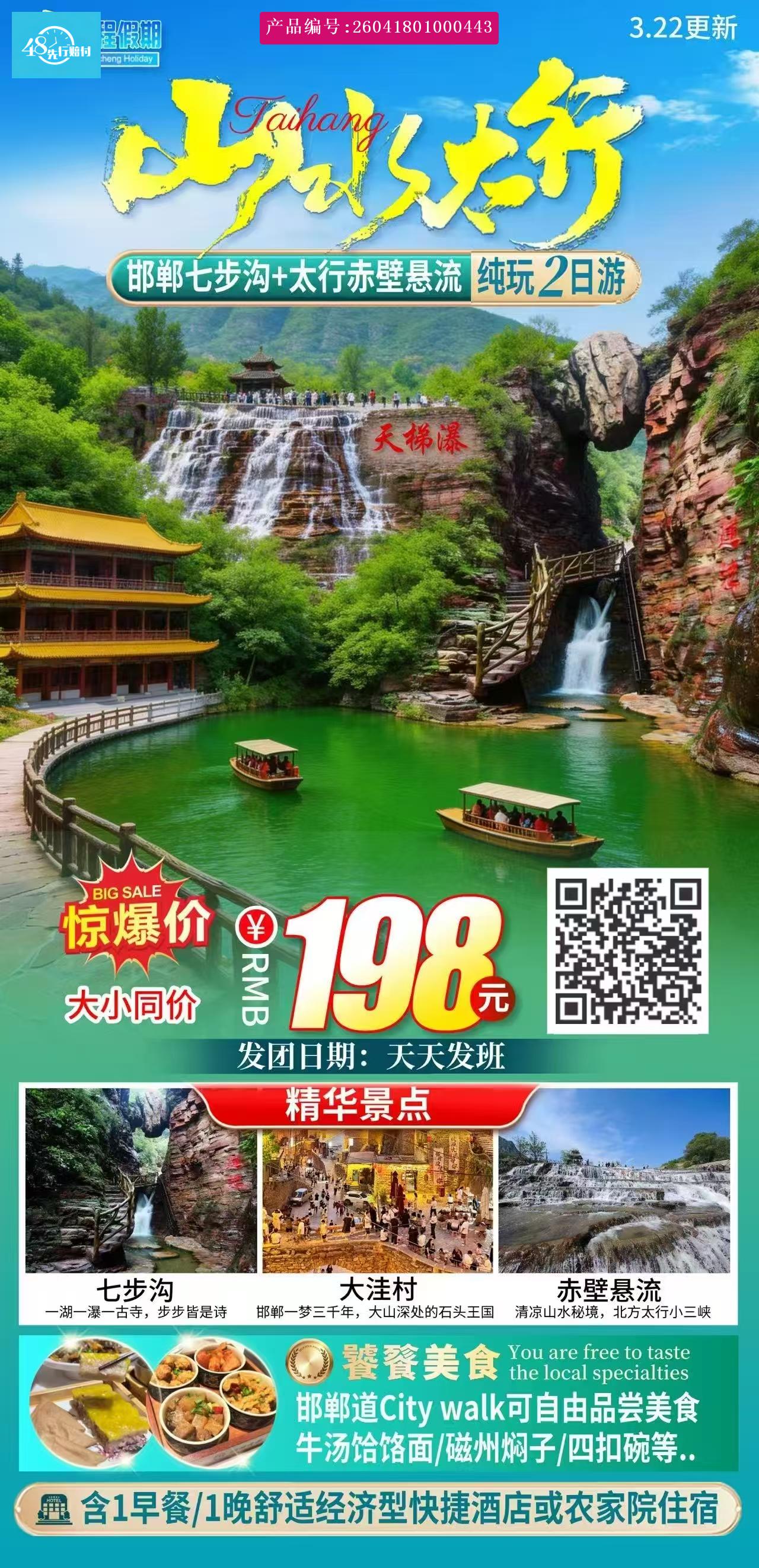早上指定时间出发前往邯郸市七步沟景区,此景区位于河北省邯郸市武安境内,总面积20平方公里,由门景区、休闲度假区、百瀑峡、罗汉峡、三棱山、马武寨六个景区组成,集绿色、古色、红色旅游资源和独特地质资源之大成。 [p]游览路线 [br] [/p] [p]经典环线(适合体力中等者) [br] [/p] [p] [br] [/p] [p]️路线:景区入口 → 天镜湖 → 罗汉峡 → 红石寨 → 马武寨 → 隐士塔 → 南天门 → 下山步道返回。 [br] [/p] [p]亮点:天镜湖碧水清澈罗汉峡奇石林立, [br] [/p] [p] 南天门可俯瞰群山。 [br] [/p] [p]耗时:约3-4小时(含拍照休息) [br] [/p] [p] [br] [/p] [p]轻松休闲路线(适合家庭/老人) [br] [/p] [p]️路线:景区入口 → 天镜湖 → 水上乐园(夏季可选)→ 隐士塔。 [br] [/p] [p]特点:地势平缓,沿途多休憩点,适合慢游。 [br] [/p] [p]随后乘车前往邯郸涉县大洼村,大洼村位于河北省邯郸市涉县更乐镇东部,是一个历史悠久的传统村落,被誉为太行山里的“石头王国”。 大洼村始建于明朝嘉靖年间,由一户张姓人家繁衍而来,至今已传了28代,是家族式的村落。村内的建筑主要以石头为主,房屋、街道、院墙乃至屋顶都由石头堆砌而成,充满了古朴的韵味。大洼村的建筑风格独特,具有很强的“布达拉宫”式建筑的立体感,被誉为北方的“小布达拉宫”。 [br] [/p] [p]随后前往酒店休息。 [br] [/p]
