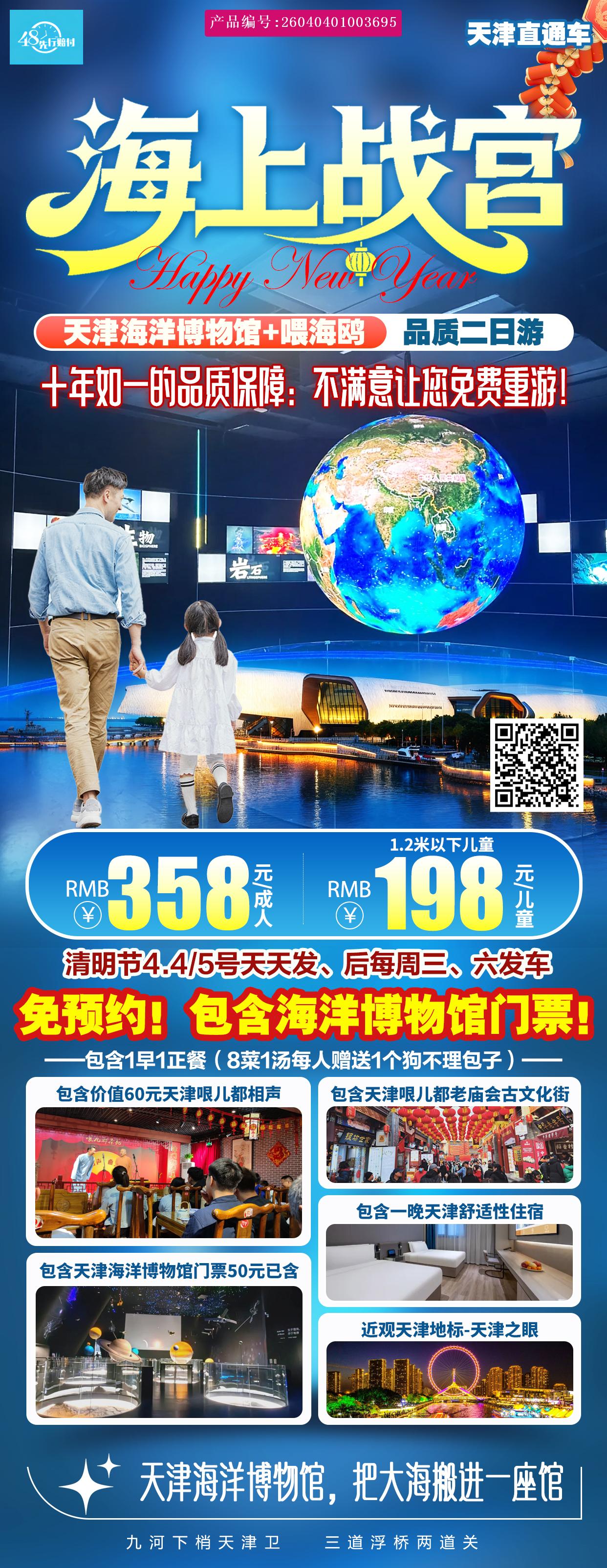 [p]住宿标准:全程1晚当地快捷酒店 [br] [/p] [p]敬请组团社提醒游客给予理解并配合;若产生单男单女由客人现补差价或安排三人间或拼房若客人需另外安排单间,则需另补房价)。 [br] [/p]备注:天津地区整体住宿水平有限,大多数酒店没有一次性用品(自备),请大家调整心态,休闲旅游为主。报价:成人358元/位 儿童:1.2米以下198元/人 下只含半餐、车费、导服购物:全程仅一当地土特产超市旅游交通:当地空调旅游车包车(签订合同后,因游客原因取消,座位费不退)自费海上项目游船出海100元/位自理不列入自费项目(个人消费,完全自愿)用餐标准:1早1正餐(正餐为8菜一汤,每人一个狗不理包子)导游服务:全程优秀导游陪同服务景点门票:所列景点首道门票。
