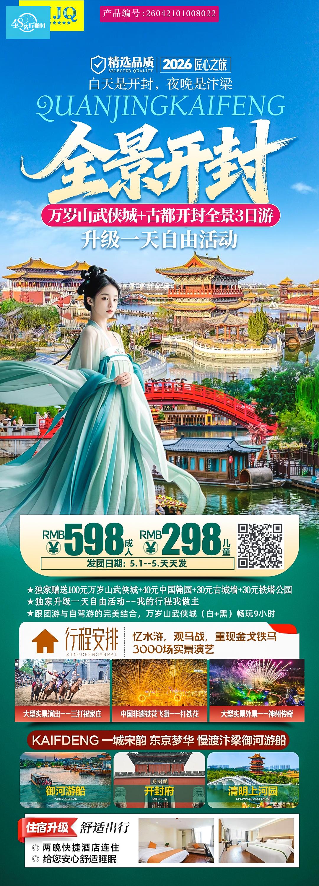 早乘车赴有着“琪树明霞五凤楼,夷门自古帝王州”、“汴京富丽天下无”之美誉的八朝古都——开封,后赴国家 [p]皇家园林--国家AAAA级风景区【万岁山武侠城】(门票100元/人包含),赏万岁寺感皇家寺院之辉煌, [br] [/p] [p]游古城墙人防工事,体验大宋武侠之风,也可自由观赏景区内大宋文化影视剧:《武松醉打蒋门神》、《野猪林》、 [br] [/p] [p]《十字坡》《劫镖》《武林推盟》《比武招亲》《风雪山神庙》《七侠五义》;忆水浒,观马战,重现金戈铁马 [br] [/p] [p]的城寨沙场;观看大型实景演出《三打祝家庄》等演出内容;万岁山大宋武侠城的海船广场,每晚20:00上演的 [br] [/p] [p]《神舟传奇》,现代科技融合传奇故事,带你探索海上丝绸之路,领略大宋王朝的繁荣经济、发达科技和昌盛文化, [br] [/p] [p]让你大呼过瘾;禁军教头宿破庙,怒发冲冠上梁山的《风雪山神庙》在万岁山大宋武侠城的城寨沙场,伴随着“叮 [br] [/p] [p]叮当当”的敲击声,看铁水腾空一瞬间漫天银花落,中国非遗--铁花飞溅(超值推荐,非常震撼),流星如瀑,声震天宇,蔚为大观万点星辰开,绝美、壮观; [br] [/p]