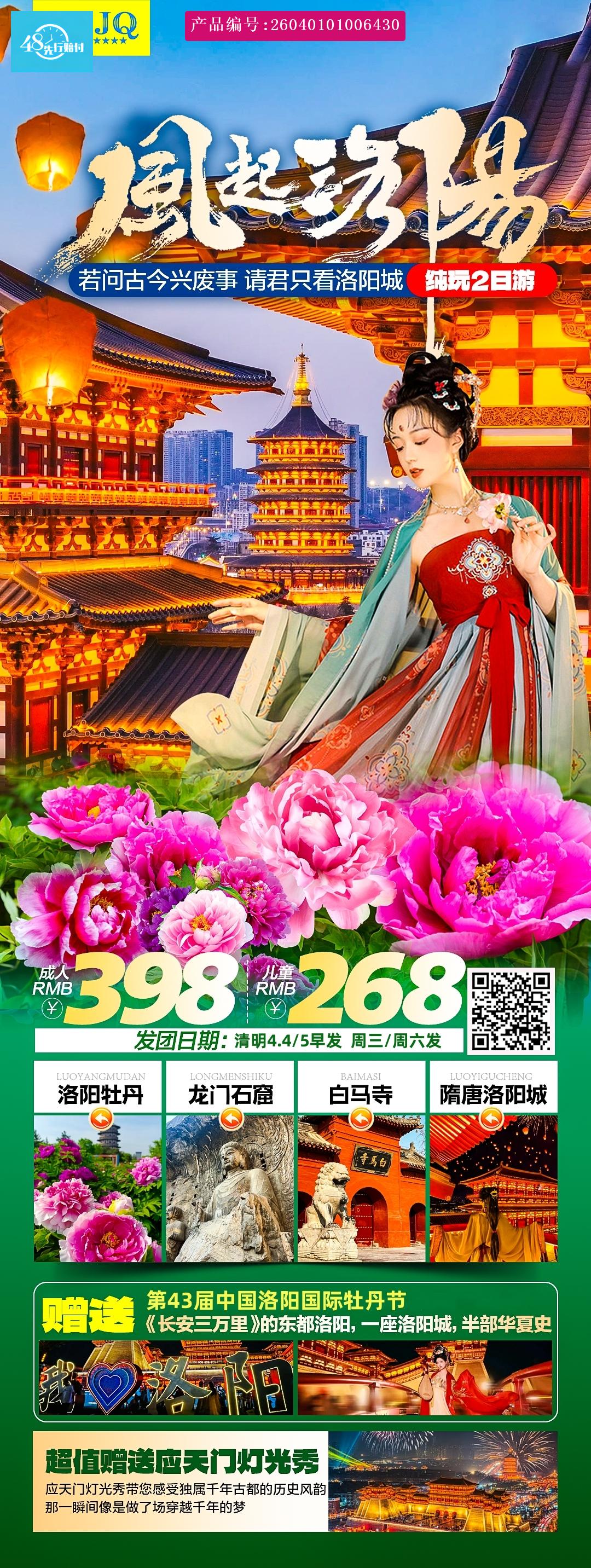 [p]7、推荐自理:1.洛阳首部大型宫廷园林实景演出--【凤舞神都】(168元/人自愿自理) [br] [/p]8、其它自理:龙门石窟(90元/人自愿自理);龙门电瓶车单程10元/人自愿自理;2.龙门耳机15元/人自愿自理 白马寺35/人