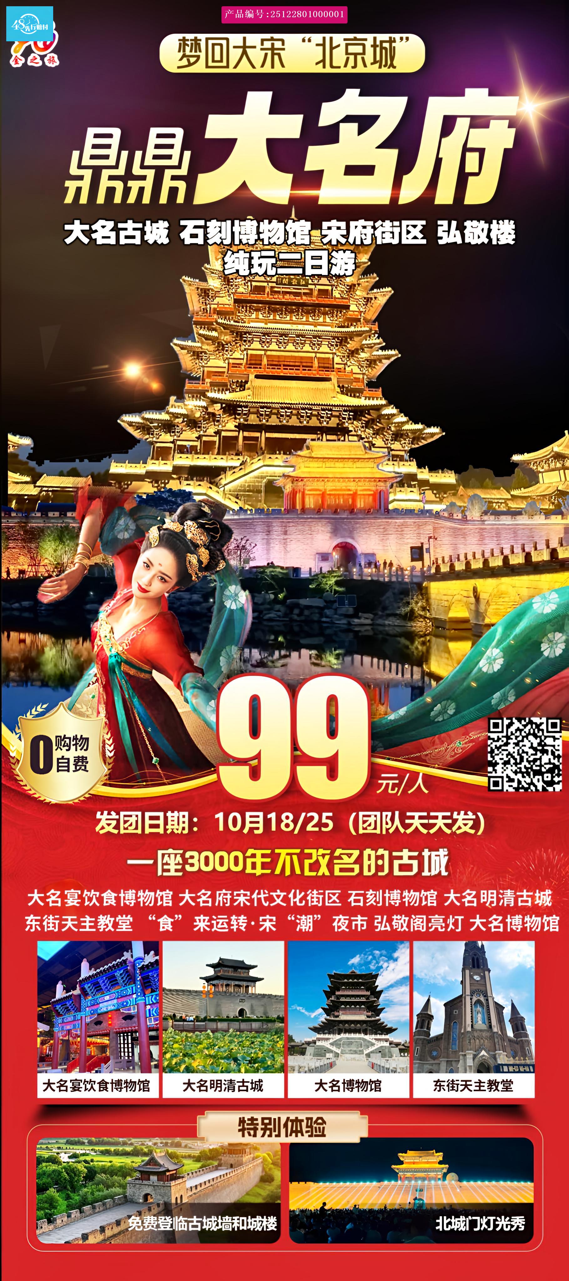 [p]1、交通:往返空调旅游车; [br] [/p] [p]2、用餐:1早(正餐自理); [br] [/p] [p]3、住宿:快捷酒店2-3人标间,(独卫、独浴、自带洗漱用品); [br] [/p] [p]4、门票:大名景点均为免费,如遇政策性收费请现补门票; [br] [/p] [p]5、导游:全程优秀导游服务; [br] [/p] [p]6、保险:旅行社责任险,建议客人购买旅游人身意外伤害保险; [br] [/p]7、购物:全程无购物(博物馆不算店)