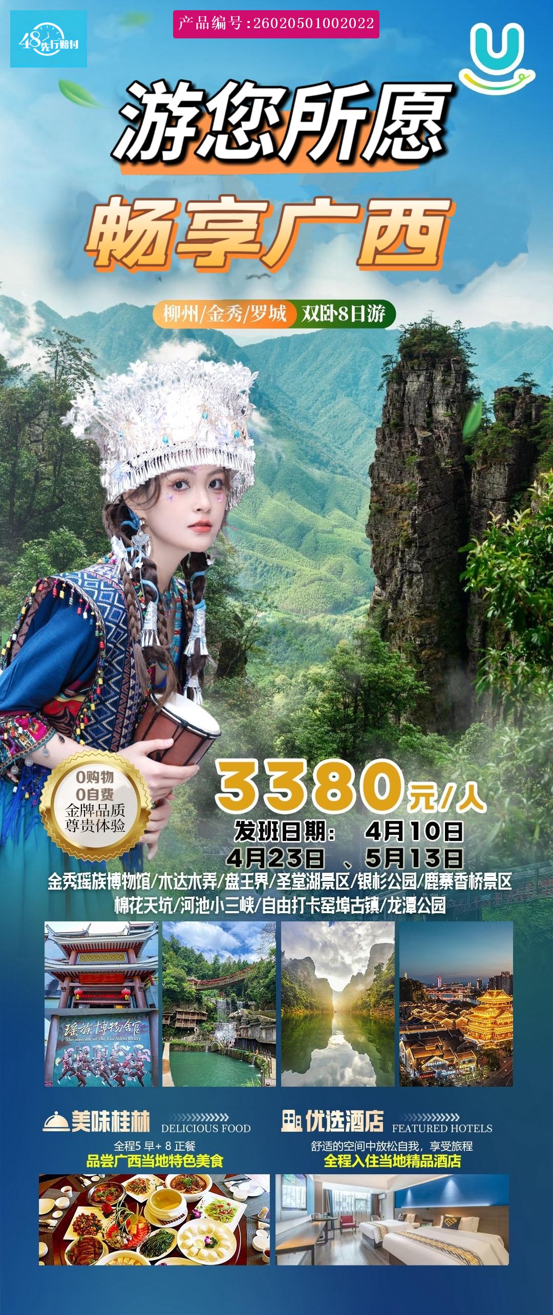 [p]1、【住宿】行程所列酒店住宿费用。广西区内 5 晚当地准4或网评3钻或2钻酒店。 [br] [/p] [p]单男、女或占床小孩如不能拼住需补房差; [br] [/p] [p]2、旅游旺季和节假日期间, 由于房源紧张,旅行社可能安排其他不低于所选等级以上标准住宿; [br] [/p] [p]3、【用餐】5 早 8 正(酒店含早餐,综合餐标40 元/人,八菜一汤 ,十人一桌 ,不含酒水;(不够人数按比例上菜) ,导游接计划后客人取消用餐 ,不退餐费。 [br] [/p] [p]4、【导游】 当地优秀中文导游全程服务 , 自由活动时间除外。 [br] [/p] [p]5、【交通】全程空调旅游车,车型根据实际人数安排,每人一个正座,位置以先来后到的方式安排,不便预留;行程中位子保持不变 ,如需调换请自行协商; [br] [/p]6、【景区】行程中所列景点首道大门票。不含景点第二门票及另付费项目(不含景区内小交通)备注 :全段景点已使用特惠套票 ,导游证、学生证、老年证、军官证、记者证等证件不予退费 ,如因客人原因不予退费。另如因客人自身原因中途离团或不参加其中的景点 ,不予退费;7、【保险】含旅行社责任险、不含旅游意外险(建议由组团社代买)。