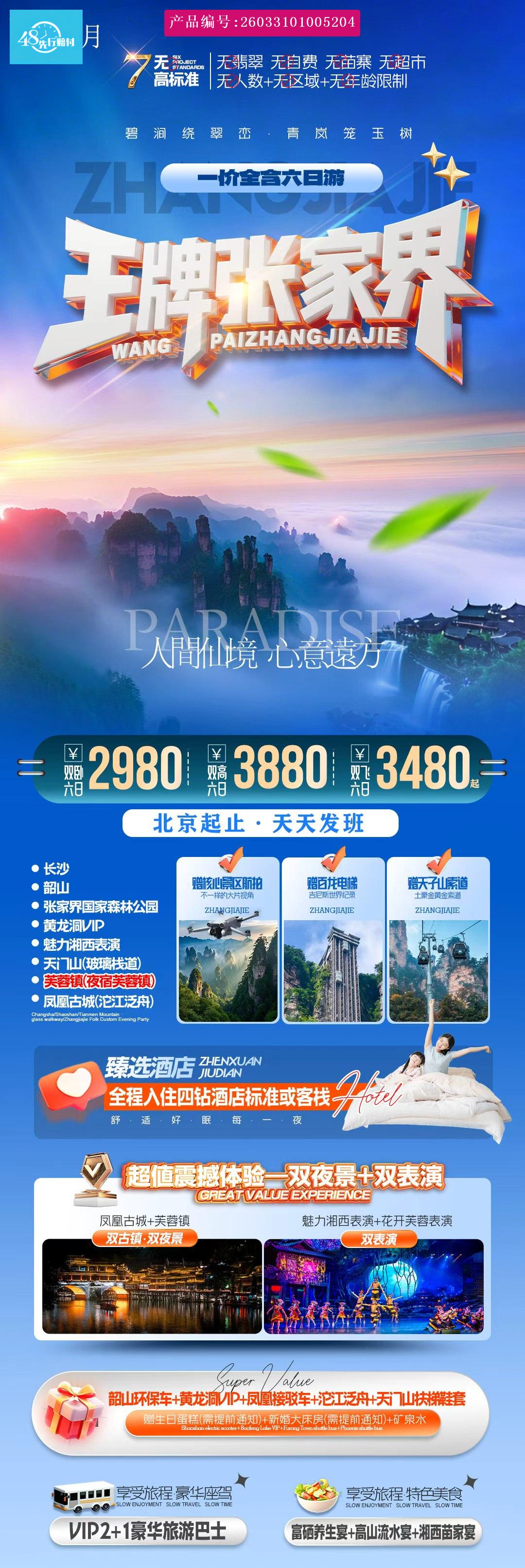 [p]●门票:张家界森林公园+天门山+百龙电梯+天子山索道+凤凰接驳车+黄龙洞VIP+土司城+魅力湘西+芙蓉镇; [br] [/p] [p]●住房:全程入住携程四钻酒店或客栈; [br] [/p] [p]●用餐:行程所列餐(3早5正);正餐30元/人:特色餐导游根据时间合理安排。10人一桌9菜一汤,不含酒水, [br] [/p] [p]若客人自动放弃用餐,费用均不退; [br] [/p] [p]●用车:2+1VIP空调旅游大巴车(车辆大小由旅行社根据游客人数调整,保证每位游客1个正坐); [br] [/p] [p]特别提示:如张家界 VlP 旅行车资源紧张不够用,则更改为常规旅行车(保证 25%空坐率)请理解; [br] [/p] [p]●导游:正规中文导游全程优质服务; [br] [/p] [p]●大交通:北京-长沙往返火车硬卧; [br] [/p] [p]●保险:含旅行社责任险; [br] [/p] [p]●儿童价标准:1.2米以下儿童仅含当地车位、导服和半餐,其余均不含; [br] [/p] [p]●购物:全程无购物店(土司王府、凤凰古城景区内设购物场所,属于景区商业行为,不是本行程安排购物); [br] [/p]【森林公园、土司王府等部分景区内设购物场所,属于景区商业行为,不算本行程安排购物点】