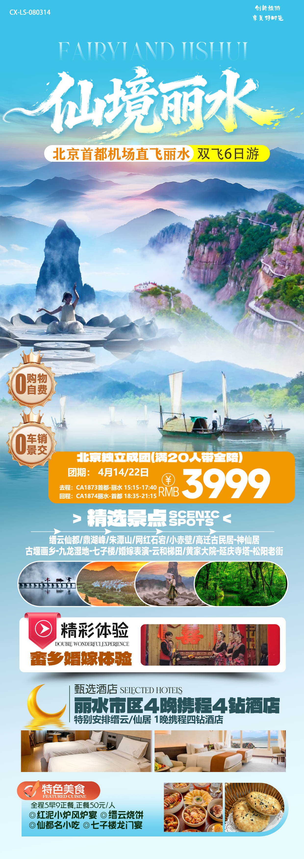 丽水-仙都-仙居 [p]上午 :游览仙都【鼎湖峰】(车程约45分钟 ,游玩时间约2小时) :鼎湖峰拔地而起高170.8米 ,是世界最高大柱石 ,俗称石笋 ,有“天下第一峰 ” ,“天下第一石 “天下第一笋”之誉。是《花千骨》 、《锦绣未央》 、《道士下山》 、《天龙八部》 、《绝代双骄》等著名电影影视剧外景拍摄基地。火山喷发口----步虚山。黄帝祠宇感受黄帝文化。【朱潭山】(游览时间约45分钟)这如诗如画的风光是仙都的精华 ,拍摄鼎湖峰远景最佳处。是《笑傲江湖》《绝代双骄》 、《天龙八部》 、《轩辕剑》等数十部影视剧的拍摄基地。下午:【打卡网红石宕】(游览时间约1小时)缙云的岩宕形态多样、规模庞大 , 独”、 唯一性突出 ,在境内层叠穿连 ,通天接地 ,气势恢弘 , 国内罕见。走进景区9号和10号岩宕 ,从高处俯瞰 ,金色的阳光摩挲着粗粝的岩宕 ,在周边行走 ,感觉一秒穿越到千年前的敦煌。【小赤壁】(游玩时间约1小时) 、大肚岩、龙耕路、婆媳岩、舅轿岩等。晚餐后适时出发前往仙居入住酒店(车程约2小时) [br] [/p]