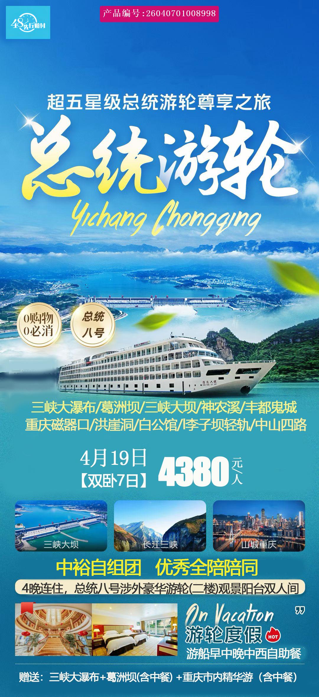 [p]1、船舱住宿:涉外超五星豪华游船,双人阳台标准间4晚连住(独立阳台、中央空调、彩电、24小时热水 独立卫生间)(我公司不提供自然单间,单男单女可与游船上其他同性别男/女拼房合住,无需补单房差,如不愿意拼房。则需出发前补齐单间房差) [br] [/p] [p] 2、餐饮标准:游轮4早6正(游船统一安排中西自助餐);陆地含2中(宜昌1中餐+重庆1中餐;10人一桌 8菜一汤,不含酒水;不够10人 [br] [/p] [p] 菜量菜品相应减少) [br] [/p] [p] 3、旅游巴士:根据人数安排车型 保证每人一个正座 [br] [/p] [p] 4、往返交通:往返火车空调硬卧 [br] [/p] [p] 5、导游服务:游船中英文船陪服务 [br] [/p] [p] 6、景点门票:以上所列景区首道大门票 (全程门票已按最优惠的价格核算,再无优惠可退) [br] [/p] [p] 7、保险:旅行社责任险,建议客人自行购物旅游意外险 [br] [/p] [p] 8、游船小费自愿给予 [br] [/p] [p] 【购物】:纯玩无购物,重庆土特产超市不算店;且景区中公共购物场所,不属于我社安排的购物店,请慎重购买 [br] [/p] [p] 备注:1:全程用餐和景点门票为游船打包价格,无任何优惠证件退费,若客人自动放弃用餐及景点,费用均不退 [br] [/p] [p] 2:游船住宿楼层为船上随机分配,如客人指定楼层以大厅所在层为基础楼层,每上升一层加收150元/人 [/p]