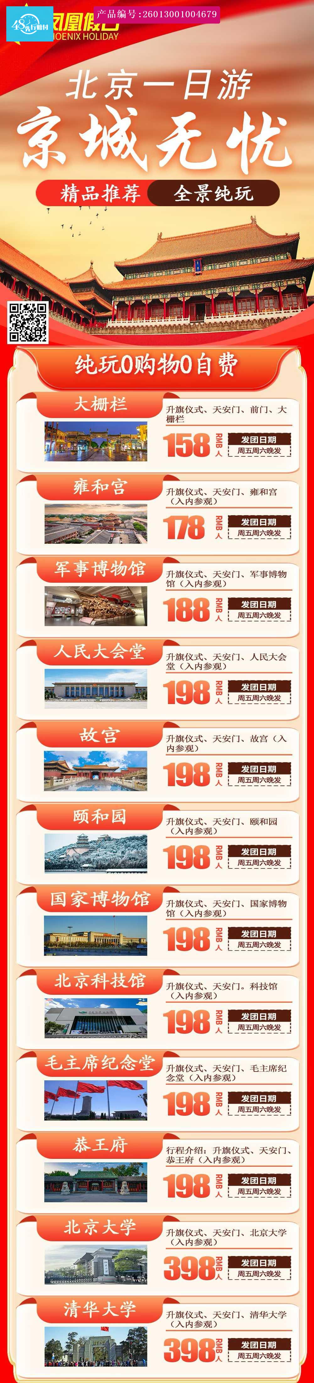 北京所有景区门票需提前预定,(老人/未成年/军官/残疾证无任何优惠)注:因交通管制,进入天安门广场故宫/恭王府需要乘坐当地摆渡车/公交或地铁,全程30元/人必消。