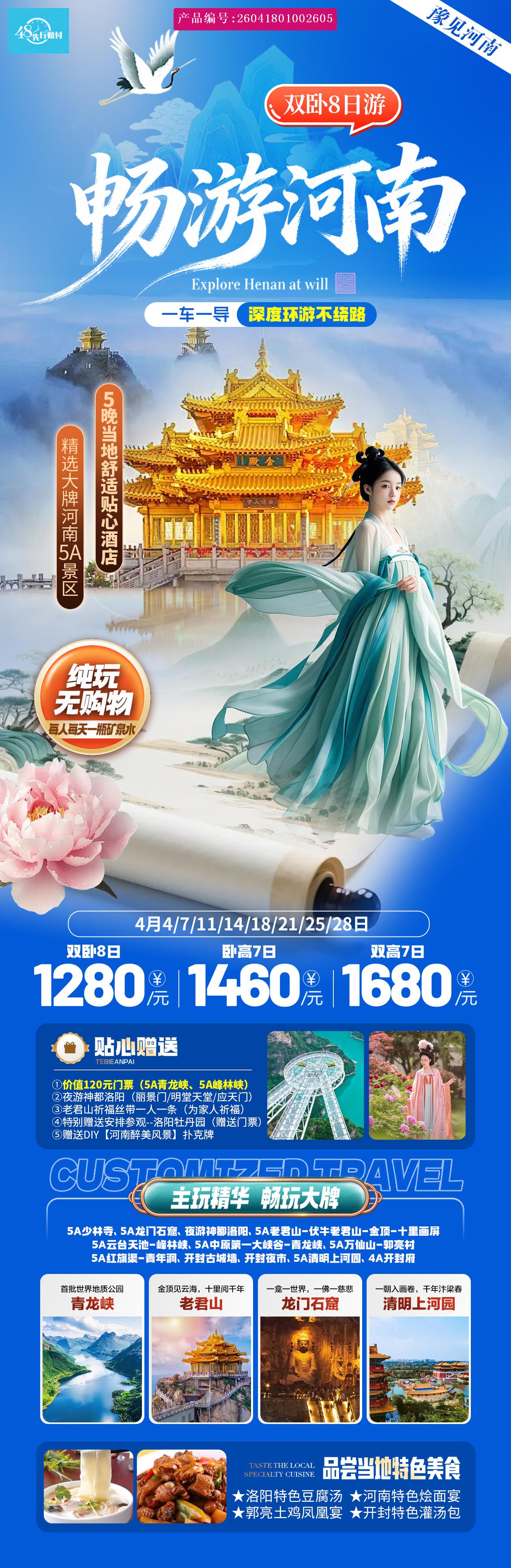门票差价当地现补 [p] 门票不含,请根据年龄段在当地自补门票:景区:60岁以下60-69岁70岁以上少林寺80元/人 0元/人0元/人龙门石窟90元/人 0元/人0元/人老君山100元/人 0元/人0元/人万仙山 [br] [/p] [p]+太行山传奇62元/人23元/人23元/人青龙峡独家赠送40元门票独家赠送40元门票独家赠送40元门票峰林峡独家赠送60元门票独家赠送60元门票独家赠送60元门票红旗渠80元/人 0元/人0元/人清明上河园120元/人 60-69岁半价60元/人0元/人开封府65元60-69岁半价32元0元打包价: 550元/人 115元/人23元/人 [br] [/p] [p]升级套餐老君山一段索道+青龙峡景交+峰林峡景交+万仙山景交+当地车导综合服务费+各景区保险=499元/人(报名即代表同意此升级套餐,请于当地现付导游。) [/p] [p]费用不含 [/p] [p]1、少林寺单程电瓶车15元(建议乘坐),龙门石窟往返电瓶车20元(建议乘坐) [br] [/p] [p]2、少林寺+龙门石窟耳麦合用30元(无噪音景区,建议租用) [br] [/p] [p]3、老君山 二段索道80元/人(自愿选择) [br] [/p] [p]4、青龙峡 往返索道=120/人(建议乘坐) [br] [/p] [p]5、峰林峡上行索道+船票+天空之境套票=120/人(建议乘坐) [br] [/p] [p]6、万仙山大环线电瓶车60元/人 (自愿选择) [br] [/p]