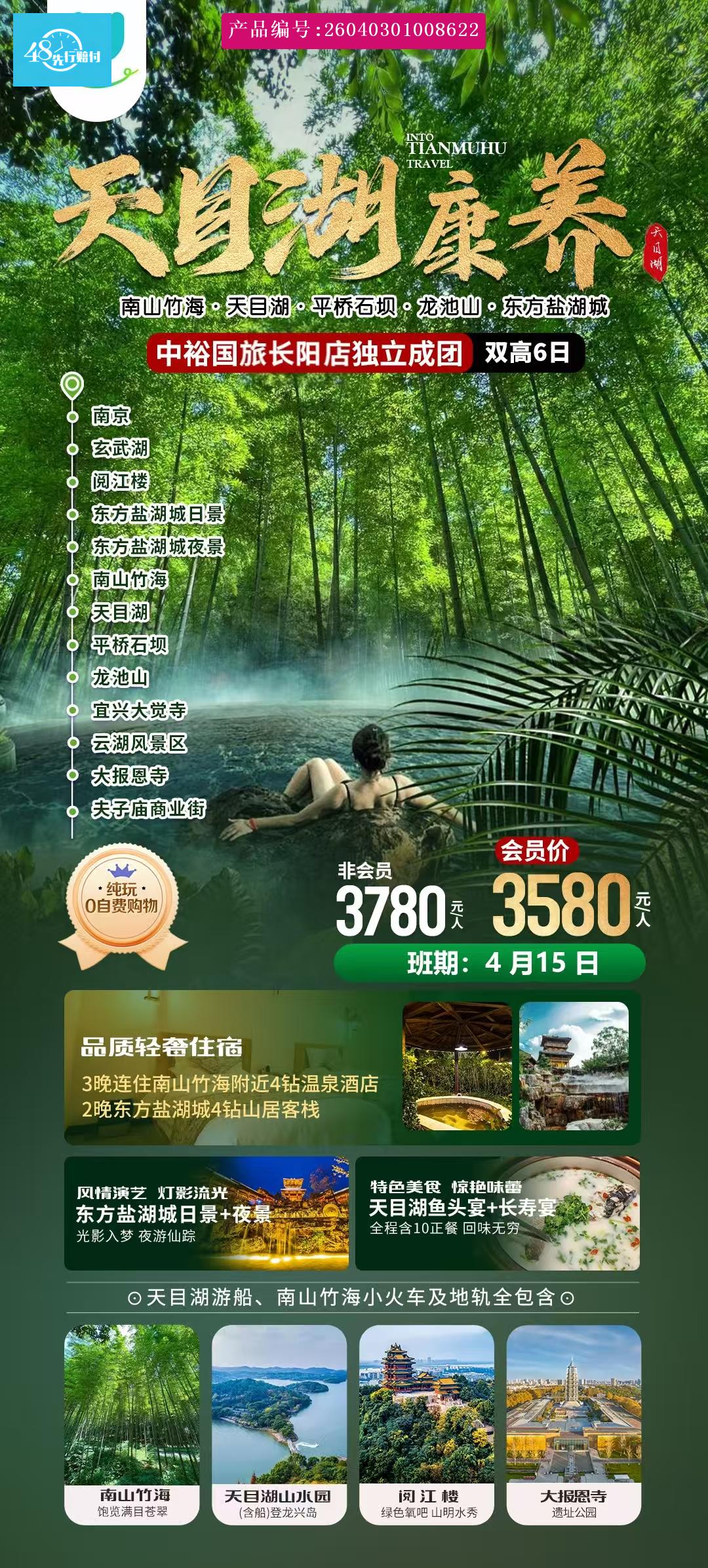 [p]早餐:自助早餐;开始美好的一天。 [br] [/p] [p]游览:【天目湖山水园】,沿湖边漫步,乘坐天目湖经典项目——【赠送游船】,赏湖光山色,养情山水。第一站龙兴岛,赏半月潭美景,或到彩蝶谷,与蝶共舞,之后登上景区制高点天目揽胜,一览天目全景;再次乘坐游船前往中国茶岛,参观中国茶文化苑、白茶馆,全面了解源远流长的茶文化历史。或与吉尼斯世界纪录认证的天下第一壶合影留恋。 [br] [/p] [p]下午:【KTV狂欢】:1. 你一曲我一歌, KTV里乐翻天。��狂欢之夜, 不醉不归, 让快乐在此刻定格。2. KTV狂欢夜, 畅唱不停歇!举杯共饮, 快乐无边界。3. 音符飘扬����狂欢不止, 今夜KTV最闪亮 [br] [/p] [p]体验:【温泉】:酒店特色温泉 [br] [/p]活动:【麻将/棋牌室】返回酒店后,客人可进行自由活动;为了丰富客人旅程,酒店免费提供麻将室和棋牌室,可供客人游玩!(9:00-22:00可进行游玩;该项目为酒店增值体验项目,自动取消无费用退减,需提前预约)