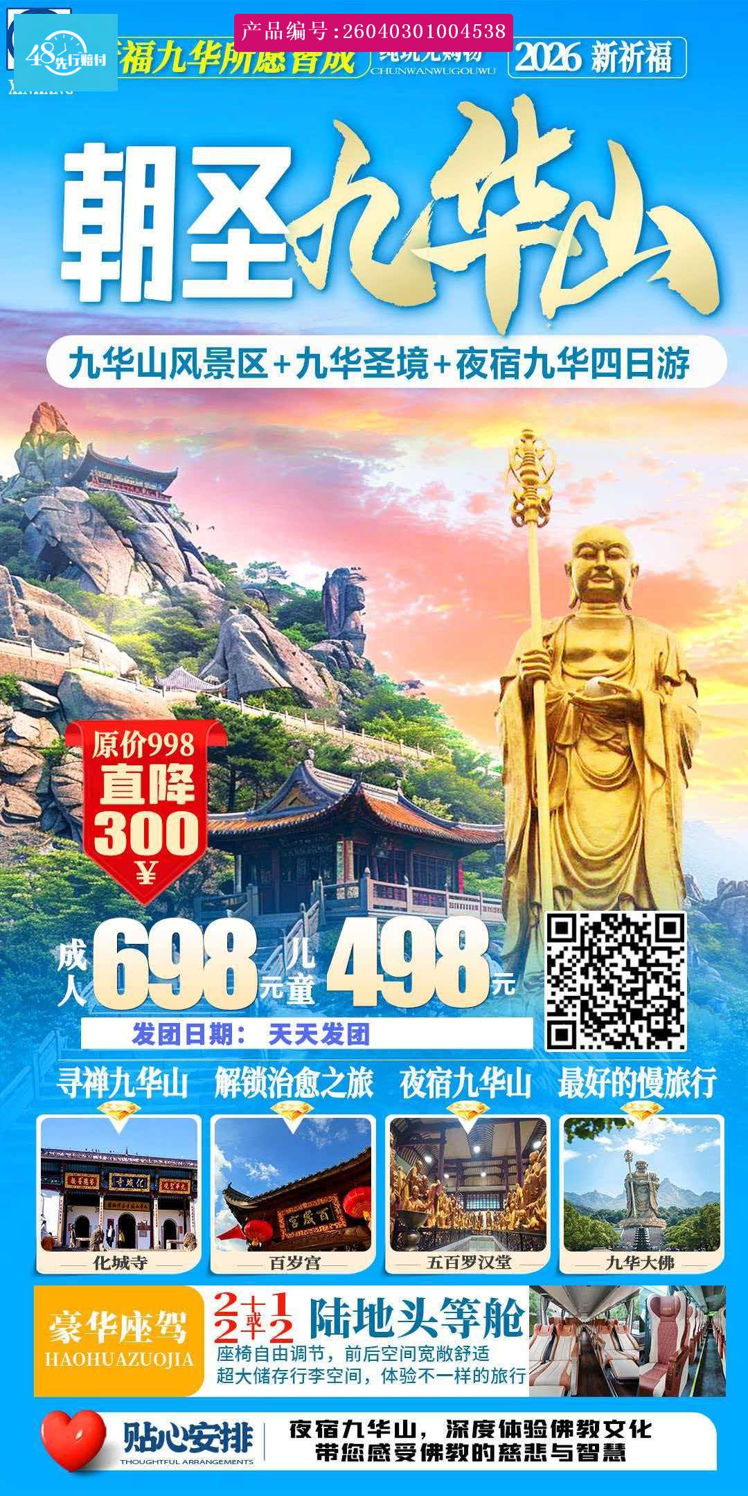 [p]7、索道自愿自理: [br] [/p]百岁宫地轨:单程55元/人,往返100元/人;天台索道:单程85元/人,往返160元/人 [p]【九华山风景区】(门票根据年龄段自理60周岁以下自理160元/人,60-64周岁自理80元/人,65周岁以上免票),换乘景交至九华街(往返景交车50元/人需自理) [/p]