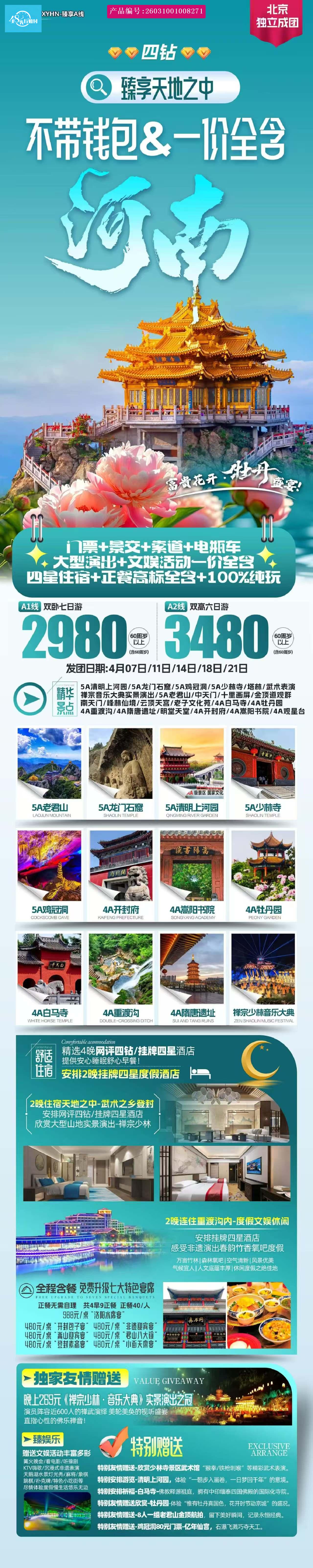 [p]上午北京西乘G653次(07:39-11:12)或G1579次(08:32-12:05)或G501次(08:42-12:30)或G969次(09:10-12:39)或G979次(09:15-12:49)或G689次(09:20-13:00)或G655次(09:40-13:22)或相邻时段车次二等座赴河南郑州东站。 [br] [/p] [p]下午北京西乘G521次(13:10-16:20)或685次(13:15-16:49)或G673次(13:46-17:36)或G331次(15:10-17:30)或G1589次(15:40-19:08)或者其它相邻时段高铁二等座赴郑州东站。 [br] [/p] [p]备注:抵达后赠送单独派车送至郑州火车站周边酒店入住(出团通知提前告知酒店地址和名字),抵达酒店后自由活动... [br] [/p] [p]可自由打卡二七纪念塔、中原福塔、德化步行街、河南省博、郑州银基商圈、只有河南等郑州地标...自由活动后入住郑州酒店。 [/p]