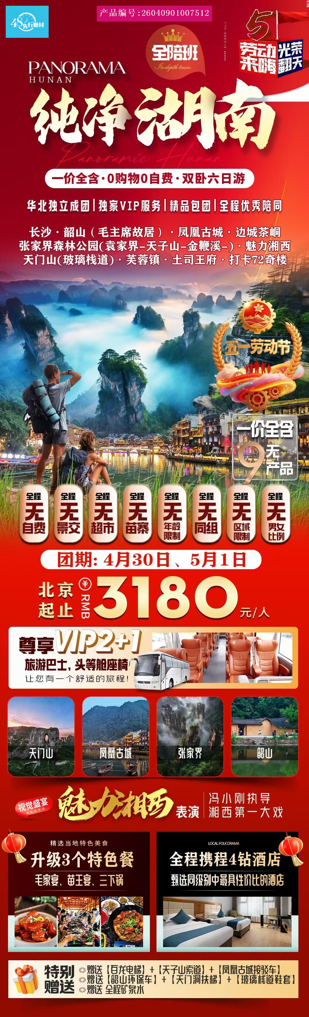 [p]●门票:张家界国家森林公园+天门山+边城+魅力湘西+芙蓉镇,赠送百龙电梯+天子山索道+天门洞双程扶梯+ [br] [/p] [p]鞋套+韶山环保车+土司王府(赠送景点不去不退,亦不做等价交换,儿童不享受此赠送项目); [br] [/p] [p]●住房:全程携程4钻标准酒店双标间; [br] [/p] [p]●用餐:行程所列餐(3早6正);正餐30元/人:特色餐导游根据时间合理安排。10人一桌9菜一汤,不含酒水, [br] [/p] [p]若客人自动放弃用餐,费用均不退; [br] [/p] [p]●用车:当地豪华2+1VIP空调旅游车; [br] [/p] [p]●导游:优秀国证导游服务; [br] [/p] [p]●大交通:北京-长沙、张家界-北京火车硬卧; [br] [/p] [p]●保险:旅行社责任险; [br] [/p] [p]●购物:全程无购物店(土司王府、武陵阁景区内设购物场所,属于景区商业行为,不是本行程安排购物); [br] [/p] [p]长沙南到凤凰的高铁,以及凤凰站到酒店的接站 [/p]
