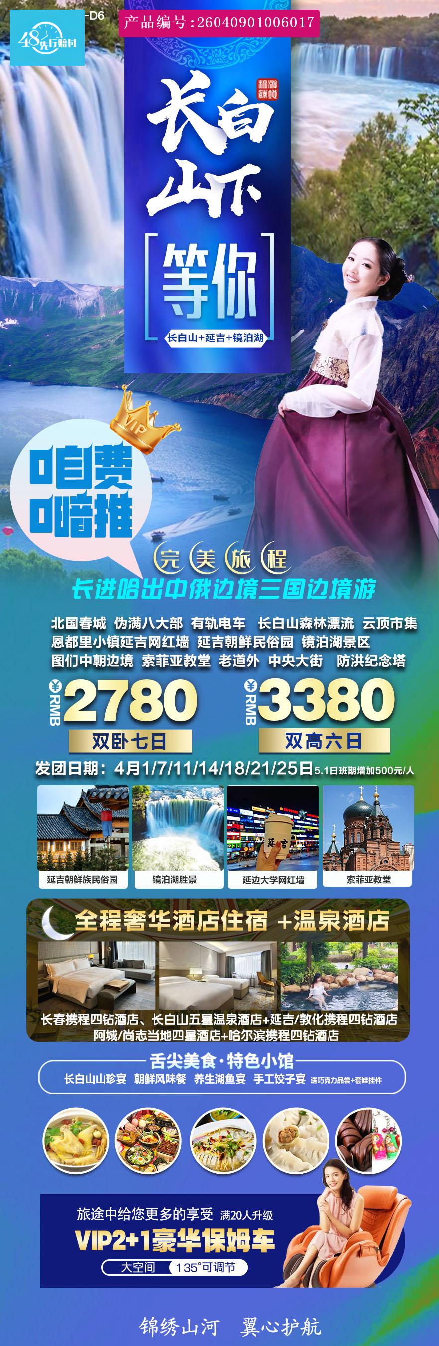 [p]大交通:北京-长春火车硬卧;哈尔滨-北京火车硬卧 [br] [/p] [p]当地交通:安排2+1航空座椅车辆(每团满20人及以上升级,最后一排不能向后调节);接送机为赠送项目,故不提供上述标准用车,保证每人一正座。 [br] [/p] [p]用餐:早餐(酒店含早,不占床不含早,住几晚酒店含几个早)+4特色美食 [br] [/p] [p](全程用餐为十人一桌,每桌八菜一汤,人数不够,酌情减量;如不用餐,费用不退。) [br] [/p] [p]门票:包含长白山大门票、镜泊湖大门票 [br] [/p] [p]赠送景点:长白山森林漂流、朝鲜民俗园、稻米驿站、云顶市集、恩都里、图们日光山、哈尔滨道外巴洛克、索菲亚教堂(外观)、中央大街(赠送项目因个人原因,或景区及不可抗拒因素导致无法参观,无任何费用可退,请谅解。)(温馨提示:该产品报价为综合优惠价格,赠送景点持学生证、残疾证、军官证、导游证、记者证等优惠证件不能减免门票费用,不去不退。 [br] [/p] [p](参团时必须持身份证配合购票。儿童因不含门票请旅游者于景区售票处自购,赠送项目也需自理) [br] [/p] [p]赠送景点不去不退费,特殊原因无法参观不退费用,儿童因不含门票请旅游者于景区售票处自购。 [br] [/p] [p]根据当地情况,会调整景区游览以及住宿先后顺序,但保证所有行程全部游览完毕。 [/p] [p]导游:落地后中文优秀导游(持国证)一站式服务; (10人以下司兼导) [br] [/p] [p]住宿: 全程明示4钻/当地4星酒店+长白山升级当地5星温泉酒店 [br] [/p] [p](不提供自然单间,如出现单人出行,请自觉补交房差) [br] [/p] [p]保险:含旅行社当地责任险 [br] [/p]儿童:含车位、导服、正餐半餐 (儿童提前含门票+180元/人) 注:2周岁以上12周岁以下儿童不含门票、床位及早餐。车位、导服、正餐半餐