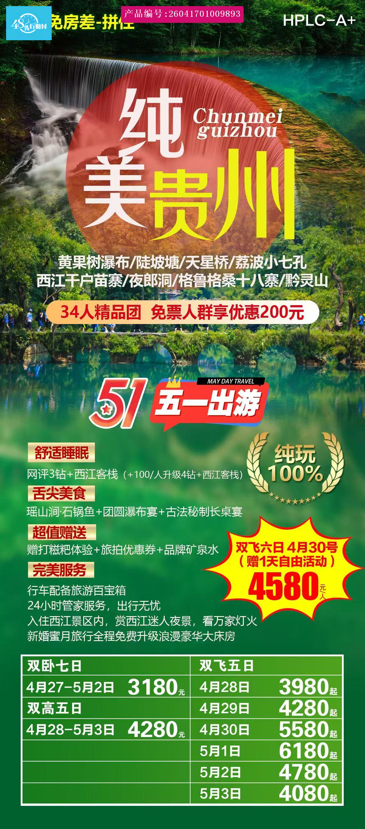 早餐后,乘车(约4H)前往荔波,游览世界自然遗产地,国家级AAAAA景区,中国最美丽的地方【小七孔】(不含电瓶车40元/人,保险10元/人,必须消费敬请自理)在宽仅1公里、长12公里的狭长幽谷里,集洞、林、湖、瀑、石、水多种景观于一体,玲珑秀丽,有“超级盆景”的和镶嵌在地球腰带上的绿宝石美誉。游览景区名字由来地【小七孔古桥】。欣赏景区灵动多姿的各色瀑布:起迭着【68级跌水瀑布】,顺贽而下,奔泻而去;【拉雅瀑布】布精巧醉人,水珠飞溅;【卧龙潭瀑布】银丝泻地,潭水色彩斑斑斓绚丽;【翠谷瀑布】在群峰紧锁中苍翠欲滴。感受赤足湿身乐趣的【水上森林】,清澈的水流冲刷着青石,行走于其中,宛若身临琼瑶仙池;【鸳鸯湖泛舟】(不含鸳鸯湖游船30元/人,非必须消费项目,自愿消费)—寻找一份爱情;妩媚而迷人的【响水河】更是贯穿了整个风景区。注意事项:小七孔景区内,路面湿滑,请小心行走,注意安全;景区外街边均为个体商户店铺,非旅行社安排,请谨慎购买。 [p] 之后乘车前往国家级AAAA景区【西江千户苗寨】(不含电瓶车20元/人,保险10远/人,必须消费敬请自理),到达后乘景区电瓶车进入景区,办理完入住手续后,自由参观,参观原始的民族建筑,吊脚楼群、苗寨梯田,深入苗寨,走家串户,了解苗家人的生活以及风俗习惯。西江苗寨有1250多户,5600多人,是全国最大的苗寨,是苗族第五次大迁移的主要集散地,素有“千户苗寨”之称。晚餐后,自由活动,根据时间自行返回酒店休息。 [/p] [p]温馨提示:进入景区无行李车,需要自行携带行李步行(10-20分钟)进入景区入住酒店,建议将大件行李存放车上,仅携带贵重物品以及必备洗漱品进入景区。 [br] [/p]