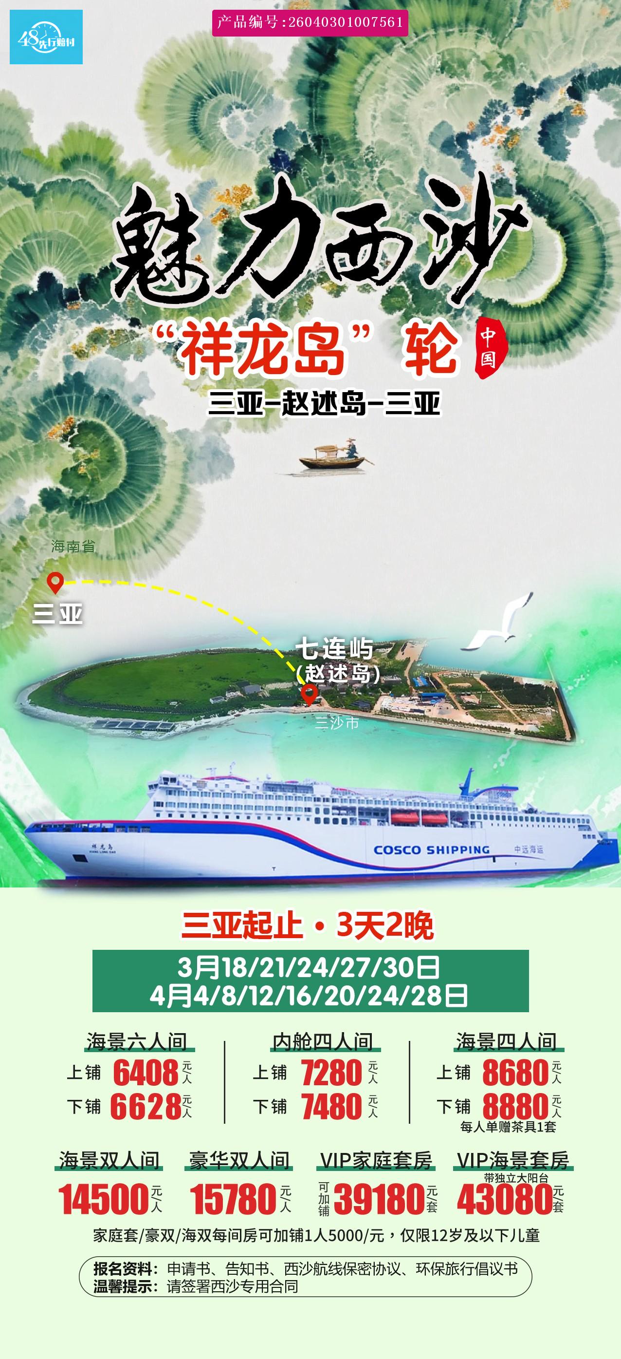 [p]1. 报名时,旅游者必须如实填报自身健康状况。对于存在包括但不限于以下情况:严重心脏病、严重高血压、严重糖尿病、肢体残疾、视力障碍、智力障碍、严重鼻窦炎、严重贫血、眩晕症、癫痫病、哮喘病、狂躁症、抑郁症等精神疾病,以及所有可能引发公共安全的传染性疾病的旅游者,船方有权拒绝其登船。此外,醉酒者、重度晕船者、过度肥胖者、行动不便者及孕妇也不得登船。 [br] [/p] [p]2. 旅游者在行程中必须在指定区域活动,严禁私自下海游泳或从事任何危险活动,包括但不限于自带器具潜水等。 [br] [/p] [p]3. 为确保旅游者在岛期间的健康与安全,请密切关注个人饮食适应性及食品安全,避免出现过敏、食物中毒等危害身体健康的情况发生。 [br] [/p] [p]4. 为了保护海洋环境,旅游者在全程中不得向大海丢弃任何垃圾,必须按照分类要求处理垃圾。 [br] [/p] [p]5. 为了保护西沙的海洋资源,旅游者不得破坏岛上的任何植被,也不得捡拾珊瑚、贝壳、砗磲等海洋生物及其碎屑、壳体携带回船。如有违反,船方有权没收并送回至岛上,并可能追究法律责任。 [br] [/p] [p]6. 岛上植被繁多,为防止火灾,旅游者禁止携带任何火种上岛,也不得在岛上吸烟。 [br] [/p] [p]7. 由于西沙旅游所处环境的特殊性,旅游者在报名时应充分了解并接受:在出发前3天,如因不可抗力原因(包括但不限于天气、海况、海事及军事管制、外交事件等)导致航程取消或延迟,旅行社和船公司均不承担责任,但将退还所有船票费用。 [br] [/p] [p]备注:不可抗力原因导致的其他情况说明和相关条款,请旅游者提前认真阅读和知晓。 [br] [/p] [p]1)因不可抗力导致船方和旅行社无法履行或无法按期继续履行合同的,旅行社和船方有权对相应内容进行调整和变更。 [br] [/p] [p]2)在旅游者与旅行社已签订西沙旅游合同,旅游者已经支付全额旅游费用后,因不可抗力因素导致无法按约定进行西沙之旅,可采用以下两种变更方式: [br] [/p] [p]① 延续合同,即旅游者可选择搭乘后续航次继续完成西沙之旅,增减的机票等其他费用由旅游者自行解决。② 终止合同,如旅行社或船方尚无开始业务操作,则应全额退还旅游者缴纳的费用。如已开始操作并已产生实际费用且无法退还时,则应在扣除已产生费用后将余款退还旅游者,但旅行社或船方应向旅游者作出实际情况说明,必要的时候需提供相应证明。 [br] [/p] [p]3)因不可抗力原因造成的旅游者乘邮轮到达西沙海域后,如海面风力达 6 级(含)及以上,或浪高达 1.5米(含)及以上的情况下,船公司有权视实时情况取消旅客登岛计划及海上一切活动,船公司及旅行社不承担违约责任。 [br] [/p] [p]4)在行程中如有旅客突发疾病且危及生命的,出于人道主义及救人为本,船公司有权变更航线或提前或延时回航。 [br] [/p]8. 参加西沙游的旅游者有义务遵守国家法律法规和国防工作要求,不得探听、拍摄和传播涉密信息。