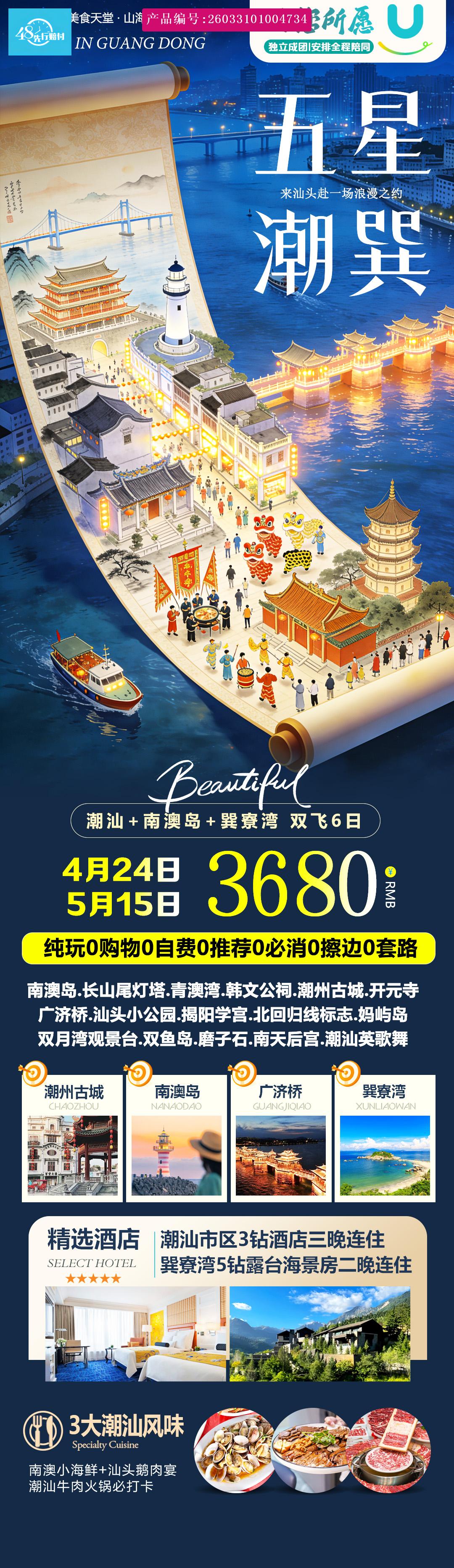 [p]1. 大交通:北京-潮汕往返经济舱团队机票; [br] [/p] [p]2. 住宿:全程入住4晚3钻酒店+升级1晚5 钻住宿:5 钻富力湾丽轩43平方露台望海房或同级; [br] [/p] [p]3. 用餐:5 个酒店含早,5 个正餐:南澳海鲜小炒+潮汕牛肉火锅+卤鹅+海鲜大盘菜+团队用餐、不吃不退费; [/p] [p]4. 门票:全程景区首道大门票; [br] [/p] [p]5. 用车:当地正规空调旅游大巴 ,保证 1 人 1 正座(自由活动期间不含车); [br] [/p]6. 导游:当地专业中文导游服务(不足 10 人不派导游); [p]7. 保险:包含旅行社责任险 ,建议游客自行购买旅游意外保险。 [/p]