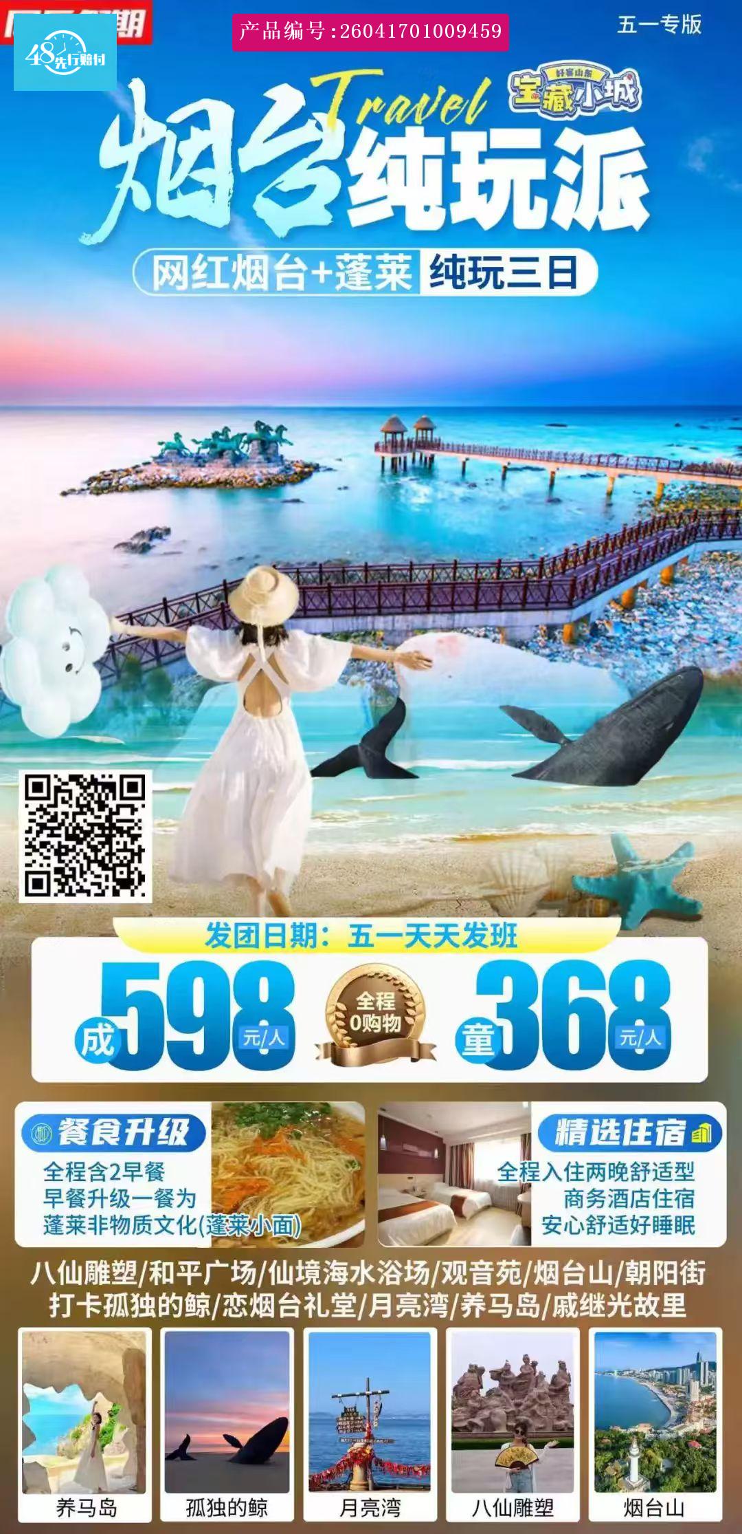 [p]一觉睡到自然醒自行观看日出 [br] [/p] [p]【观音苑景区】参观全国最大的汉白玉四面观音、景区为民族古典风格式建筑。园内四周植垂柳、景致秀丽。 [br] [/p] [p]【孤独的鲸】一鲸落万物生,巨大的鲸鱼雕塑像搁浅在海滩之上,无论是拍整体还是分开拍鲸头鲸尾,都巨巨巨出片。 [br] [/p] [p]【恋烟台礼堂】遇见生命和生命的相遇,,真诚和真诚的碰撞,美好和美好的火花。穿过星辰,遇见大海,恋上烟台。 [br] [/p] [p]【烟台山】烟台山看到中洲岛和解放大桥,也能拍出古厝和西方建筑同框的照片。 [br] [/p] [p]【朝阳街】朝阳街的名字藏着地理密码——因地处烟台山之阳,故称“朝阳大街”。1872年建街后,这里逐渐成为烟台的商业与外交核心,英、美、法、德、日等17个国家在此设立领事馆与洋行,形成了亚洲现存最大的近代领事馆建筑群,也让这条街成为了“万国建筑博览”。 [br] [/p] [p]【月亮湾】月亮湾坐落在烟台最美海岸线上,西与烟台山呼应,北与芝罘岛遥望,是情侣们争相打卡的浪漫胜地。来自天南海北的青年男女在这里海誓山盟,挂起“同心锁”,请月亮老人见证爱情的永恒。 [br] [/p] [p]【养马岛风景区】岛上丘陵起伏,草木葱茏,山光海色,秀丽如画,海岛呈东北西南走向,地势南缓北峭,岛前海面宽阔,风平浪静,岛后群礁嶙峋。或天马广场自由活动.结束后安排入住! [br] [/p]