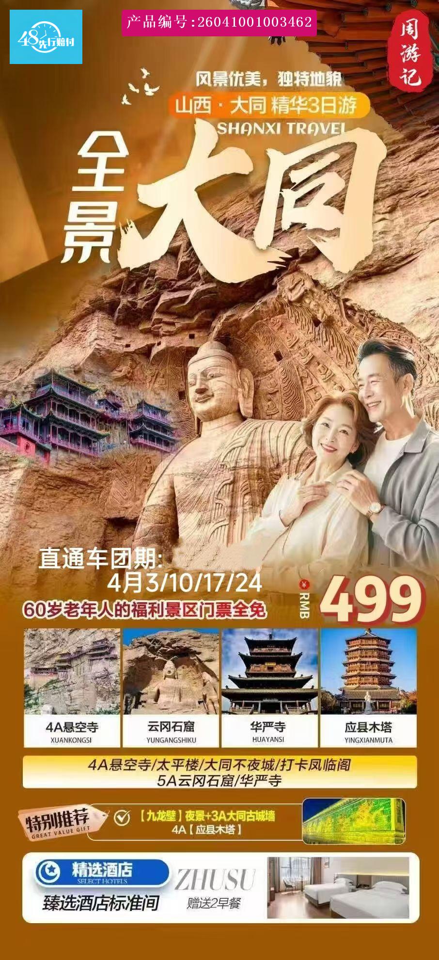 5A【云冈石窟】(约2小时) 120/人 1 米 2 以下、6 岁以下、60 以上免门票 2024年度华北地区 5A 景区游 览量第二名 ,近日来央视 《寻访山西古建之旅》大宅门白景琦扮演者陈宝 国 , 来到山西大同深 度游览云冈石窟并推向全 国各地游客 ,传播古人的智慧以及坚韧 不拔开山凿窟的毅力。 山风掠过 武周山,石窟里的光影缓缓流动。大佛沉默伫立,眉眼间藏着千年不化的温柔;栈道 上人影轻移,指尖拂过冰凉的石壁,仿佛能触到北魏工匠的凿痕 。飞天的飘带似要随 风而起,龛里的小佛静静排列,在明暗交错中,生出一种穿越时空的宁静。 [p] [p]【华严寺】(约2小时) 50/人 6 岁以下 , 1 米 2 以下 60 岁以上免门票我国现存辽金时期最大 的佛殿 ;薄伽教藏殿建于辽重熙七年(公元 1038 年),面阔五间 ,殿内依墙排列重 楼 式小木作藏经阁 38 间及“天宫楼阁”五间 ,巧夺天工 ,玲珑之致 ,被著名建筑学家 [br] [/p] [p]梁思成先生誉为“海内孤品”。大同古城西南隅,华严寺坐西朝东(契丹尊日遗风),是辽代皇家祖庙。上寺大雄宝殿巍峨立于高台,面阔九间、进深五间,是现存辽金佛殿中体量最大者;檐角高翘,南北各蹲 4.5 米的巨型琉璃鸱吻(国内最大一对),硕大斜拱撑起厚重殿顶,减柱造的内部空间开阔非凡,四壁近 900 平方米清代壁画,绘尽佛国庄严与经变故事。下寺薄伽教藏殿为辽构瑰宝,殿内环列楼阁式壁藏 38 间, [br] [/p] [p]堪称 “辽代小木作之冠 ”;合掌露齿菩萨身姿窈窕,笑意温婉,有 “东方维纳斯” 之称;殿内 31 尊辽塑,衣纹流畅,神态各异。华严宝塔榫卯纯木,铜铸千佛地宫金碧辉煌,供奉舍利,尽显古今交融之妙。阳光斜照,华严寺的飞檐在青砖上投下长长的影。风掠过月台,檐角铁马轻响。走进薄伽教藏殿,光线柔和,合掌菩萨的浅笑在静默中流转;抬头看藻井,低头抚经橱,仿佛能听见辽代工匠的凿声,在千年时光里轻轻回荡。 [br] [/p] [p]【九龙壁】(约1小时) 如进入景区 1 0/人 1 米 2 以下、6 岁以下、60 以上免门票坐南朝北,是明代朱桂 王府 门前的照壁。壁前龙池倒影,九龙若隐若现,池边垂柳依依。古城大同四牌楼东皇城街 [/p] [p]街口对面有座琉璃九龙壁,它五彩斑斓,蔚为壮观。2001 年被国务院列为第五批全国重 点文物保护单 [br] [/p] [p]位。 [br] [/p] [p]3A【大同古城墙】(约2小时) 免费开放建有主城门四座 ,东和阳、西清远、南永泰、北武定 ,同 时 还设有护城河、吊桥、箭楼、城楼、望楼、角楼、控军台等一系列军事设施 ,是中 国 古代军事防御体系的典范。 主要景观 :雁塔 :原名文峰塔 ,因春夏飞雁众多故俗称雁 塔 ,建于大明天启四年( 1624 年),位于南城墙之上 ,是一座八角七层的空心砖塔 , 与 云路、牌坊同属文庙建筑群。 [br] [/p] [p]乾楼 :建于明初 ,属于望楼的一种 ,位于八卦之首“乾”位 ,即城墙上西北楼 ,是大 同城的标志性建筑之一 ,也是古代城市的瞭望台和军事指挥中心。 [br] [/p] [/p]
