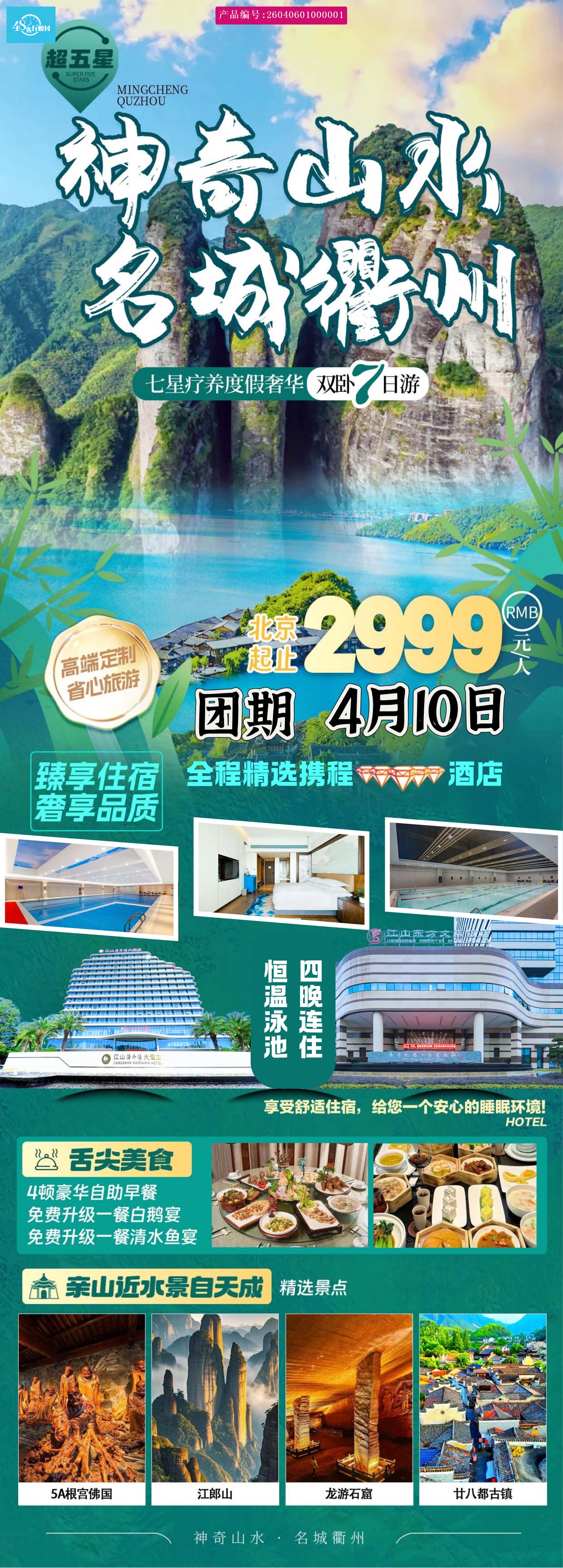 大交通北京-黄山/合肥用车当地空调旅游车 ,保证一人一座。住宿4 晚携程 5 钻酒店 ,参考东方文岚饭店 ,海外海酒店或同级。用餐4 早餐酒店早 ,8 正餐。