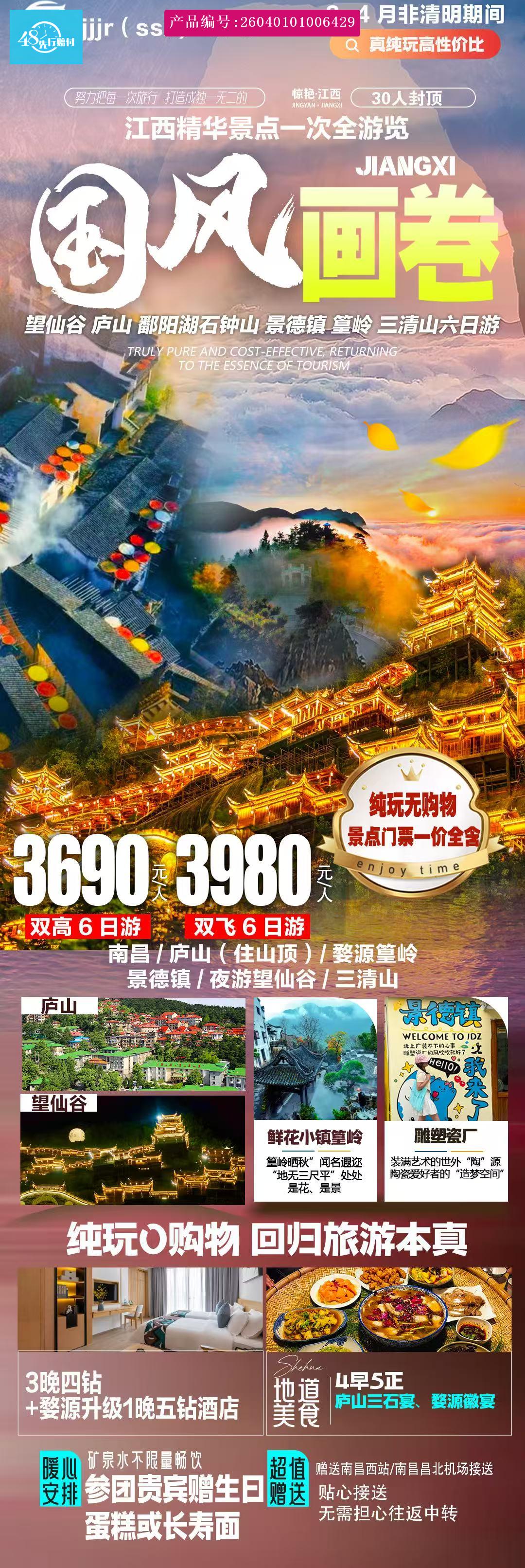 [p]1、 自费:庐山观光车90元/人、大口瀑布往返缆车50元/人、石钟山江湖游船30元/人、篁岭索道130元/人、三清山往返缆车125元/人; (必须乘坐不乘坐到不了主景区) [br] [/p] [p]推荐自费项目 当地特色,值得推荐 [br] [/p]婺女洲门票+《遇见▪婺源》山水实景演出+星空花海艺术馆+婺女洲摇橹船(单程)+升级住婺女洲景区内+鄱 阳湖全鱼宴+车费+司机导游服务费=348元/人套餐备注:小孩:1.1米以下收100/人,因此套餐为特价优惠打包价,任何证件不享受优惠,敬请谅解;