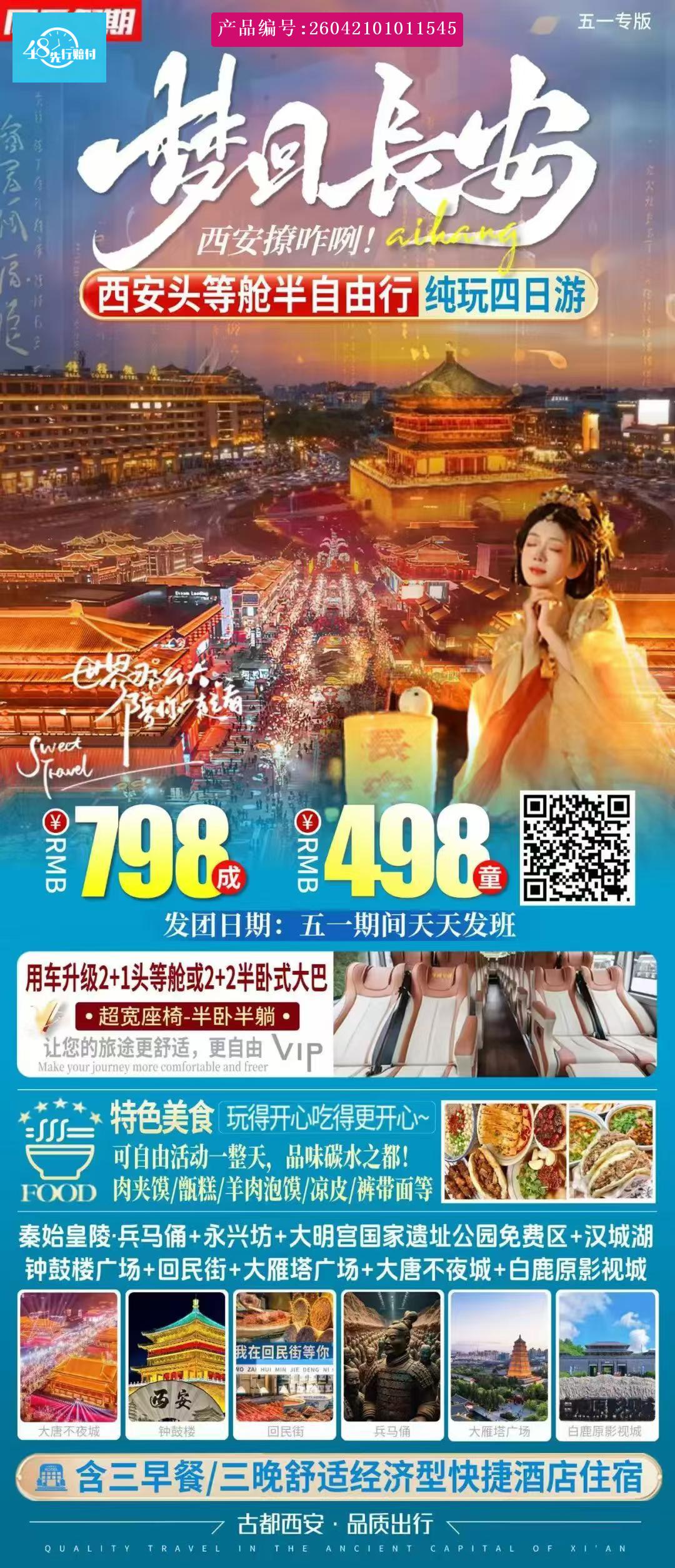 [p]一、行程所列景区门票已含(兵马俑除外),任何证件不予惠,敬请谅解! [br] [/p] [p]二、住宿:连住3晚市区商务酒店住宿(含空调、洗漱用品、彩电、热水) [br] [/p] [p]三、用餐:全程赠送3早【早餐酒店简餐】 [br] [/p] [p]四、导游:全程优秀导游服务 [br] [/p] [p]五、用车:正规旅游大巴用车,保证一人一正座 [br] [/p] [p]六、保险:旅行社责任险,建议各大旅行社购买人生意外险。 [br] [/p] [p]七、备注: [br] [/p]1.2米以下儿童含车费、半餐,当地无需必消,产生任何门票费用自理!敬请谅解!出团前24小时内取消的,需要扣除座位费400元/人