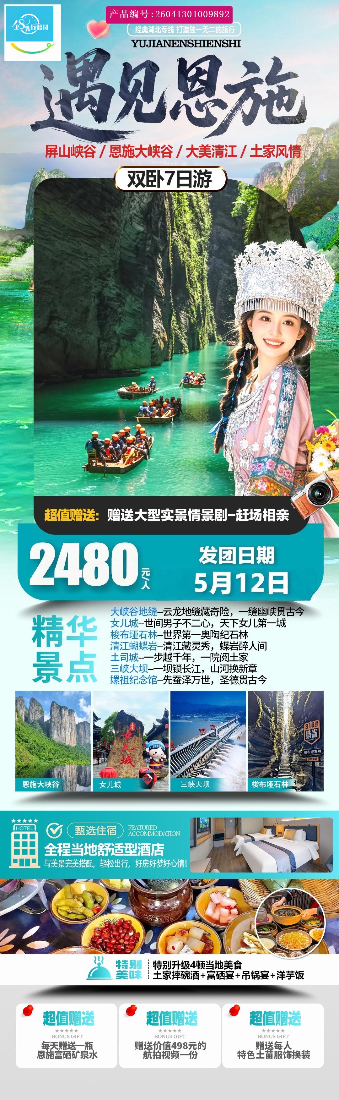 [p]●门票:清江大峡谷+土司城+恩施大峡谷(云龙河地缝)+鹤峰屏山峡谷+梭布垭石林+三峡大坝+嫘祖纪念馆+车溪民俗风情街;(含景区首道大门票) [br] [/p] [p]●住房:2晚恩施+1晚宣恩+1晚舒适型酒店(安排2人标准间,恩施酒店无三人间,如产生单房差补360元/人)。 [br] [/p] [p]参考酒店:恩施:奎苑、桂花庄园、华盛凯悦、恩施女儿会等同级酒店 [br] [/p] [p]宣恩:宣恩澜庭等同级酒店 [br] [/p] [p]宜昌:丽橙水晶店 解放路店、宜昌春霖等同级酒店 [br] [/p] [p]●用餐:行程中含 4 早 7正,酒店含早,正餐 30 元/人,其中特别升级 4 顿当地美食,土家摔碗酒、富硒宴、吊锅宴、洋芋饭(十人一桌,九菜一汤,人数增减时,菜量相应增减,维持餐标不变,不含酒水,餐不用不退)。 [br] [/p] [p]●用车:当地空调旅游车(保证空座率)。 [br] [/p] [p]●导游:优秀国证导游服务。●购物:纯玩不进店;全程安排一个土特产超市:但行程中途经的很多场所(如:景区、酒店、餐厅、火车站等)内部都设有购物性场所,此类均不属于旅行社安排 [br] [/p] [p]●大交通:北京---宜昌--北京火车硬卧。 [br] [/p]●保险:旅行社责任保险,建议购买旅游人身意外险!