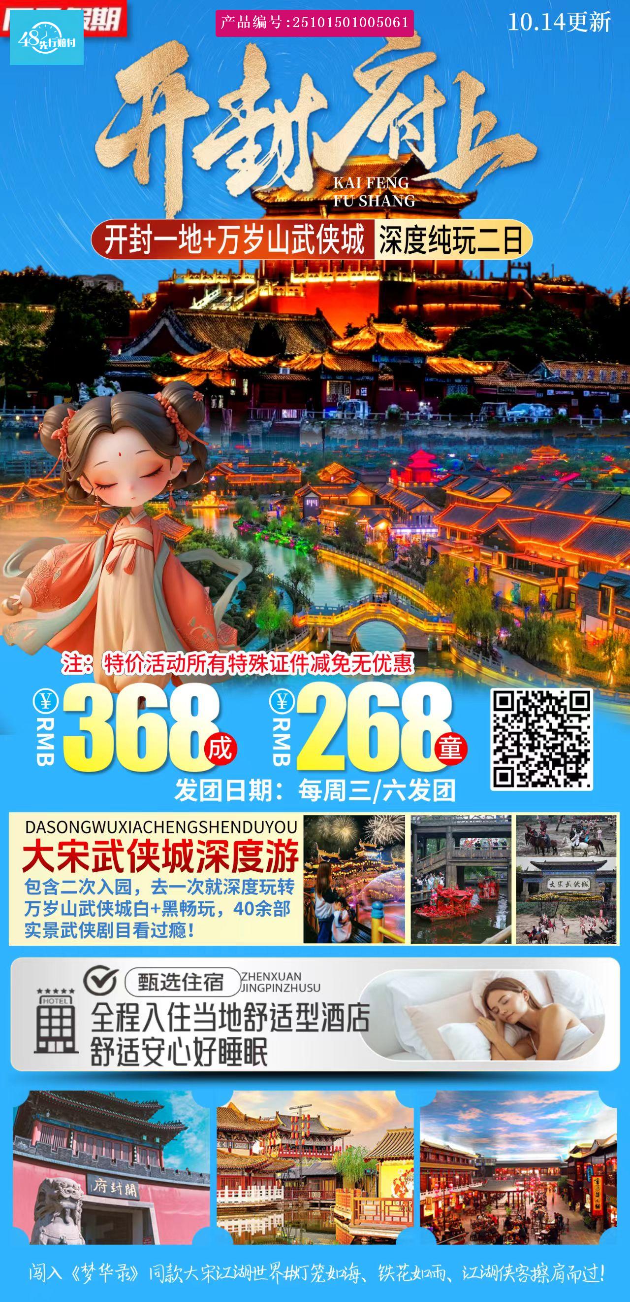 早乘车赴八朝古都开封,抵达后游览优秀景区: [p]【万岁山大宋武侠城】(价格100元/人,已含)开封万岁山·大宋武侠城作为国家AAAA级旅游景区,致力于打造中国最具魅力的沉浸式武侠演艺互动乐园。景区以大宋武侠文化为核心,精心编排大型实景演出、提升互动游乐体验、展演民俗经典、再现节庆盛景,全景式展现大宋江湖百态,全方位打造武侠寻梦之旅。被网友称为“60元看70场武侠实景演出”的“神级景区”。从《水浒》到《射雕英雄传》,从宋江、武松到郭靖、杨过,大宋王朝的江湖之中似乎从未平静过,无数的英雄侠士曾在大宋的舞台上演绎了壮阔豪迈的英雄传奇。在万岁山大宋武侠城,走进景区武侠路、城寨沙场、九龙瀑、龙坛、江湖街、大宋武馆、大宋酒作坊,会让您真切的感受到“酒酣胸胆尚开张”的武侠豪情,领略到大宋武侠文化的侠肝义胆;可欣赏《三打祝家庄》《桃花岛》《精武门》《猛龙过江》《四大名捕》《野猪林》《岳飞》等一系列节目演出,其中古装幽默实景剧《英雄救美》、大型抗日爆破实景剧《城北枪声》还能让您亲身感受到现场参与影视剧拍摄的感觉,另外20余场民俗绝活:喷火、二鬼摔跤、石锁沙袋、飞刀飞斧等众多演出全天不间断在景区内循环上演,让您感受到来自大宋江湖的震撼体验。 [br] [/p] [p]入住舒适酒店。 [br] [/p]