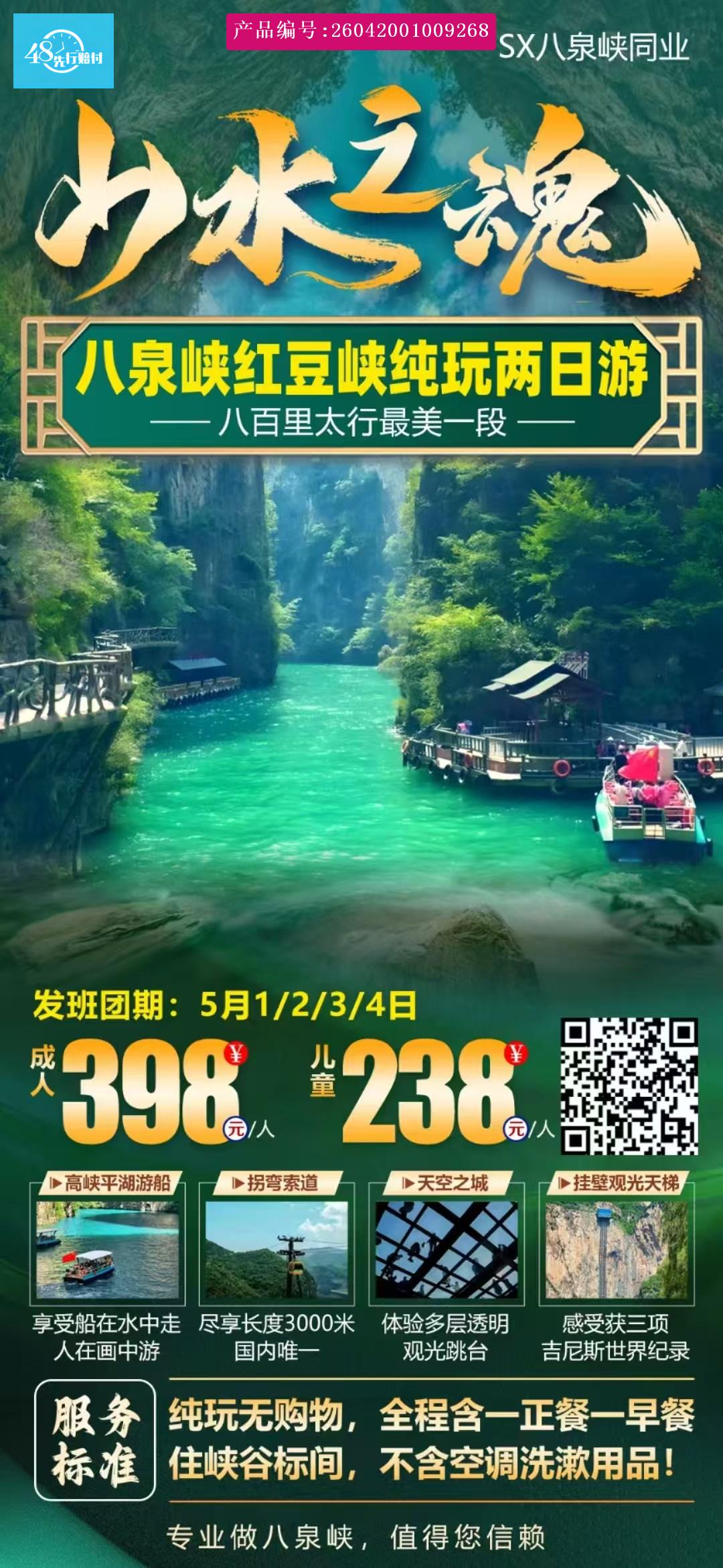 [p]1、 交通:空调旅游汽车 [br] [/p] [p]2、 住宿:农家2-3人标间 [br] [/p] [p](独卫独浴、含桌早、不含空调,自理10元/间/晚;洗漱用品自备); [br] [/p] [p]3、 用餐:1早1晚餐(晚餐八菜一汤,主食管饱,不含酒水) [br] [/p] [p]4、 门票:景点门票*(八泉峡红豆峡) [br] [/p]5、 导游:导游服务