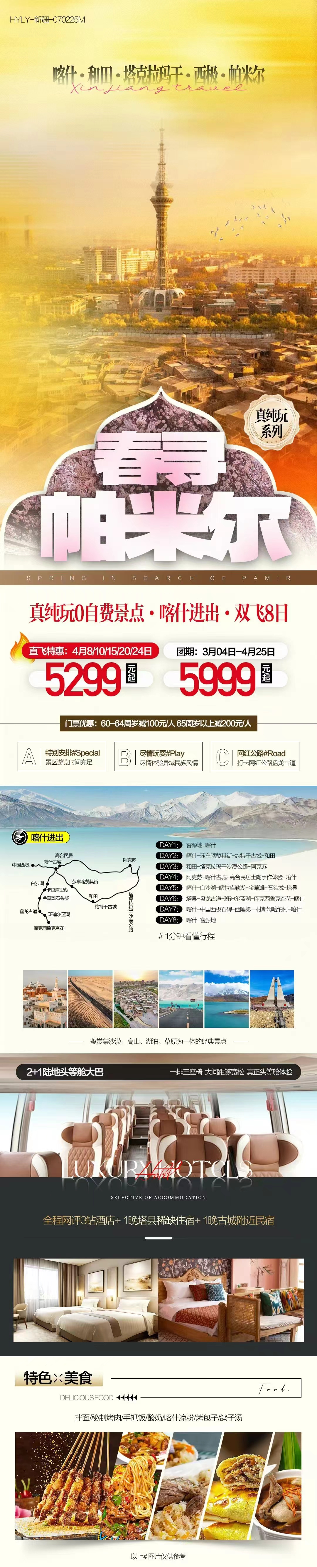 退团:报名后,如我社已经出票(出票会有凭证),客人单方退团,损失费为相应实际地接损失和10%团费违约金。敬请谅解。交通:飞机:北京-喀什-北京,飞机为直飞、经停或其他航班,以实际出票为准;提示:机票为航司团队申请机位,不可以退票.更改.签转。飞机如出现24:00 以后抵达目的地,均视为24:00 前结束行程。2017 年1 月1 日起航空新规中明确,因天气、突发事件、空中交通管制、安检以及旅客等非承运人原因,造成航班在始发地出港延误或者取消,承运人(即航空公司)应当协助旅客安排餐食和住宿,费用由旅客自理。住宿:网评3 钻酒店+1 晚塔县稀缺住宿+1 晚古城附近民宿所有行程中罗列酒店均为参考酒店,新疆旅游旺季时期在不降低住宿标准的情况下以实际所定酒店为准。参考酒店如下:喀什市:星程酒店、你好酒店、汉庭酒店、全季酒店、宜必思酒店、新海大酒店、吐曼河酒店、白玉兰酒店、其尼瓦克酒店(四星楼)、嘉悦国际酒店、川渝酒店或其他酒店(不接受指定)和田市:美豪大酒店、红石榴酒店、汉庭酒店、桔子酒店、你好酒店、文华酒店、和田印象主题酒店、和田精品酒店或其他酒店(不接受指定)阿克苏市: 域美酒店、华鑫酒店、星程酒店、桔子酒店、全季酒店、中天酒店、坤熙酒店、格林豪泰酒店、锦元大酒店或其他酒店(不接受指定)喀什市:星程酒店、你好酒店、汉庭酒店、全季酒店、宜必思酒店、新海大酒店、吐曼河酒店、白玉兰酒店、其尼瓦克酒店(四星楼)、嘉悦国际、川渝酒店或其他酒店(不接受指定)塔县:云顶酒店、格林东方、新永鸿酒店、云峰慕雪酒店、欣宜酒店、馨港国际酒店、欧罗巴酒店、世界屋脊酒店、塔莎古道酒店、犇磊鑫酒店、乔戈里酒店、前海酒店或其他酒店(不接受指定)喀什市:星程酒店、你好酒店、汉庭酒店、全季酒店、宜必思酒店、新海大酒店、吐曼河酒店、白玉兰酒店、其尼瓦克酒店(四星楼)、嘉悦国际、川渝酒店或其他酒店(不接受指定)喀什市:星程酒店、你好酒店、汉庭酒店、全季酒店、宜必思酒店、新海大酒店、吐曼河酒店、白玉兰酒店、其尼瓦克酒店(四星楼)、嘉悦国际、川渝酒店或其他酒店(不接受指定)备注:(单房差自理,不占床无早餐新疆酒店无三人间、无加床、如果有单人参加请付单房差享受一人独立用房);舒适型为国家旅游局评定三星或携程网评三钻或携程网评分3.0 以上。豪华型为国家旅游局评定四星酒店或携程网评四星或四钻酒店,单房差自理,如要求三人间或加床,需视入住酒店房型及预订情况而定。通常酒店标准间内加床为钢丝床或床垫等非标准床。门票:行程中所含景点门票提示:因参观景点需要,请游客随身带好身份证件!实际游览景点(景点首道大门票),如遇景区门票政策性上调,请客人现补差价;如客人自愿放弃行程中景点,费用不退;景点门票包含已为旅行社团队折扣价,故行程景点门票对所有证件(学生/教师/军官/老年/残疾证等)均不再享受优惠政策,其优惠价格不再进行退费。。因天气原因无法游览行程中景点不退任何费用。赠送项目不去不退。在保证服务标准及不减少旅游景点的前提下,我社有权对行程顺序景点做出调整。用餐:7 早6 正;早餐为酒店含早(不吃不退);30 元/人/正餐(含特色餐,不吃不退);备注:旅程沿线受地域限制餐饮质量有限且个别餐为路餐特色抓饭或拌面,请游客提前做好心理准备,不吃不退;另途中用餐时间难于掌握可能用餐时间会较早或较迟,请游客提前自备零食,异地旅游用餐较易引起水土不服,请自备常用药。用车:满10 人起安排2+1 航空旅游大巴+盘龙古道为7 座商务车及以下车型(接送机安排其它车型);导游:全程当地中文导游服务;提示:我社使用上岗导游均持有国家旅游局正规导游证和自治区旅游局颁发的上岗证。因新疆旅游业处于起步发展阶段,当地导游服务无法与内地导游相比较,请游客谅解。(如人数不10 人,小车司机师傅代买门票服务无导游,敬请谅解);儿童:儿童费用包含旅游车费、正餐、导游服务;