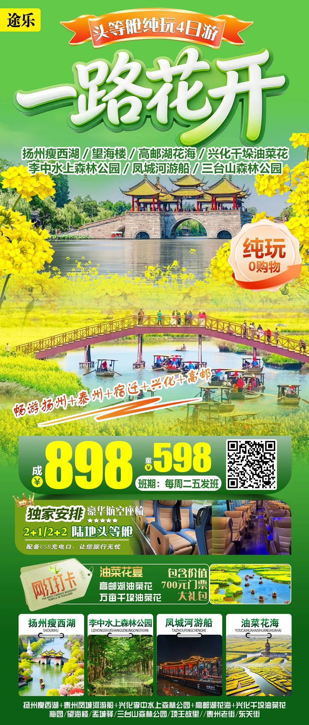 为丰富行程,高邮湖上花海乌篷船、小火车费用自理,套票价格为优惠价50元/人 [p]1.行程中需另行自费的项目、购物、小费等2.因不可抗力、交通管制等增加的食宿、交通等费用3.旅游者脱团、提前返程的费用4.单房差、加床、特殊需求产生的额外费用5.不可抗力、政府行为、第三方原因导致行程变更或取消6.旅游者违约(迟到、拒登车、脱团、)产生的费用 [/p]