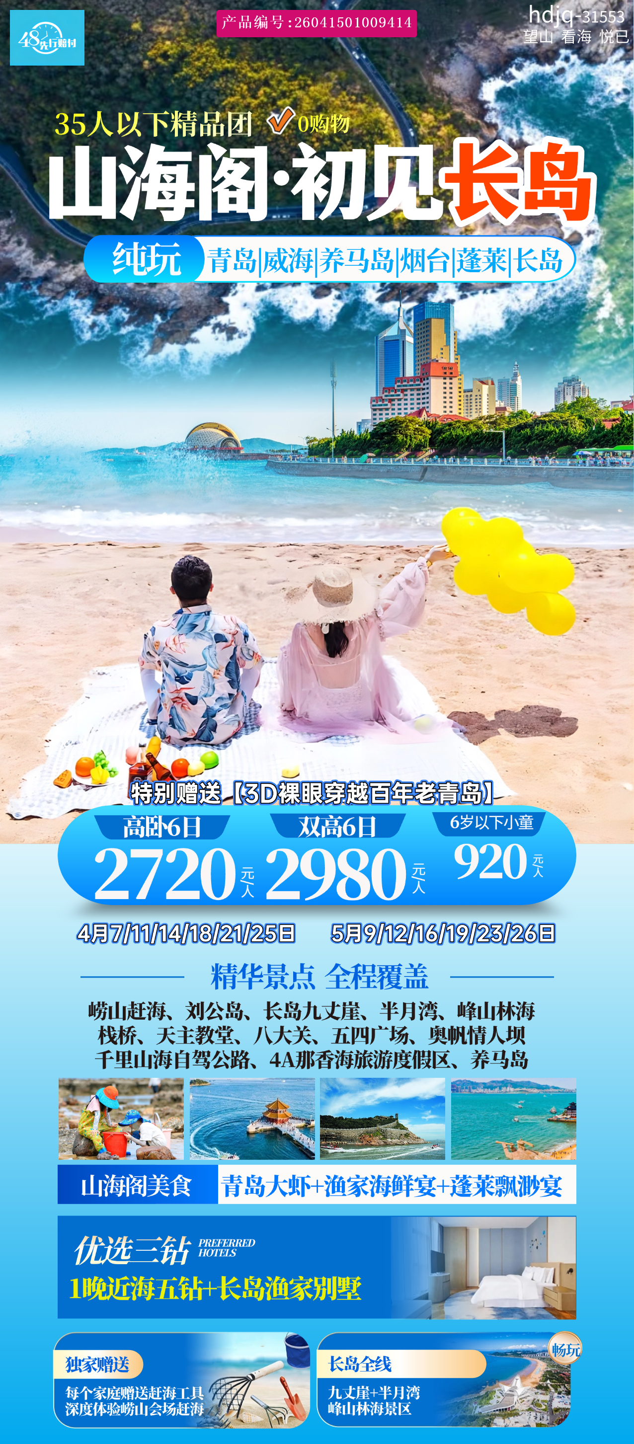 [p]交通:北京至青岛高铁二等座,青岛/烟台至北京高铁二等座。 [/p] [p] [br] [/p] [p]住宿:按携程3钻酒店标准,特别安排青岛1晚近海近商圈酒店+1晚近海5钻酒店+威海1晚全季或同级酒店+长岛内1晚别墅式渔家民宿入住(由于各地区对酒店的评定标准存在差异,本行程中所标注的住宿仅限当地酒店的评定标准,若是造成旅游者在住宿方面的心理落差,还请各位游客见谅!出现自然单男单女,于当地调整家庭房或加床或于其他客人拼住,若无法调整由客人自理单房差); [/p] [p]参考酒店: [/p] [p]青岛3钻住宿:青岛致远楼、银座和美等或同级酒店; [br] [/p] [p]近海5钻住宿:青岛美爵,蓝谷国际、海景城际、海阳盛龙建国、城投北辰等同级酒店; [br] [/p] [p]威海3钻住宿:威海全季、港发或同级酒店; [br] [/p] [p]长岛民宿住宿:怡海湾,傍海雅阁,唱晚居,屿上等别墅或同级酒店; [br] [/p] [p]青岛3钻延住:润春来、隐香山、艺龙安悦、都市花园等或同级酒店; [/p] [p]烟台3钻延住:锦江之星品尚、维也纳、前卫永聚、国襄等或同级酒店; [br] [/p] [p] [br] [/p] [p]用餐:5早5正餐(早餐为酒店早、长岛民宿早,不吃不退;其中4正餐为餐标30元/人顿,含青岛大虾宴、八仙缥缈宴,10人一桌8菜1汤,人数增减时相应菜品增减。另含1餐渔家海鲜宴,餐标60元/人顿。不吃不退,团餐不含酒水);若因故特色餐无法安排,我社将退还当餐餐费或调整同餐标正餐; [/p] [p] [br] [/p] [p]用车:当地空调旅游车,山东地接指定委派高一级GPS安全监控系统旅游车配置空调旅游车,驾驶员后第一排座位为导游工作座。成团人数调配车辆,保证每人一个正座。(自由活动期间不含用车,接团前24小时以内取消合同的客人需收车位费260元/人);长岛往返船票,岛内接送船各一次; [/p] [p] [br] [/p] [p]门票:含景点大门票,行程、景点游览顺序仅提供参考,在保证景点不减少的情况下,导游根据实际情况有权调整行程的先后顺序)如因政府原因不开放的景点,按照旅行社与景区协议价退还门票;行程中所有赠送游览或体验项目,不去不退不换,望周知理解; [/p] [p] [br] [/p] [p]导游:7人及以下司机兼向导服务,负责行程活动中接待服务,不提供景区/场馆内讲解;8人以上,持有全国导游资格证及IC卡上岗,专业导游讲解服务;长岛内仅含渔家简单讲解,不含导游。 [/p] [p] [br] [/p] [p]儿童:身高1.2米以下儿童,含当地旅游车座位,正餐半餐及导游服务,不含住宿、门票、船票、住房早餐以及赠送项目,产生其他费用由家长自理。 [br] [/p] [p] [br] [/p]长岛船票:儿童1.1米以下不需要购买船票,1.1-1.4米购买儿童半价散席,1.4米以上同成人。各码头规定不同,详细情况请参阅码头针对儿童购票细则。 [p] [br] [/p] [p]保险:含旅行社责任险,不含人身意外险、建议游客自行购买旅游意外险; [/p] [p] [br] [/p] [p]购物:全程无购物,无隐形店。 [/p]
