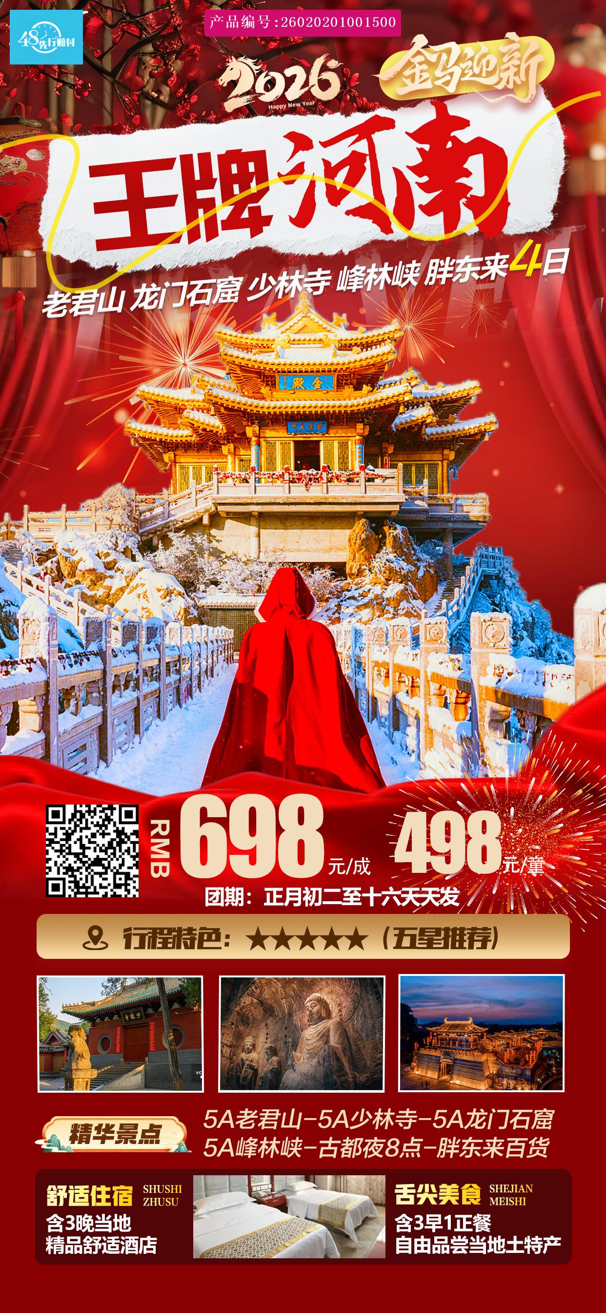[p]交通:全程空调旅游车 [br] [/p] [p]住宿:精选3晚当地舒适酒店(彩电、独卫、热水,空调) [br] [/p] [p]用餐:含3早1正餐(其他正餐可自由品尝当地风味或由导游统一代购30元/人) [br] [/p] [p]门票:少林:60周岁以上门票含,60周岁以下自理门票80元/人 [br] [/p] [p]龙门:60周岁以上门票含,60周岁以下自理门票90元/人 [br] [/p] [p]老君山:不分年龄段门票已含 [br] [/p] [p]峰林峡:不分年龄段门票已含 [br] [/p] [p](此为独家赠送,任何证件和人群不产生不退费) [br] [/p] [p]导游:全程优秀导游服务 [br] [/p] [p]保险:旅行社责任险 [br] [/p]购物:纯玩无购物,土特产超市属当地政府扶持项目,不算购物店,可免费参观品尝,自愿选购,承诺绝不强制消费。