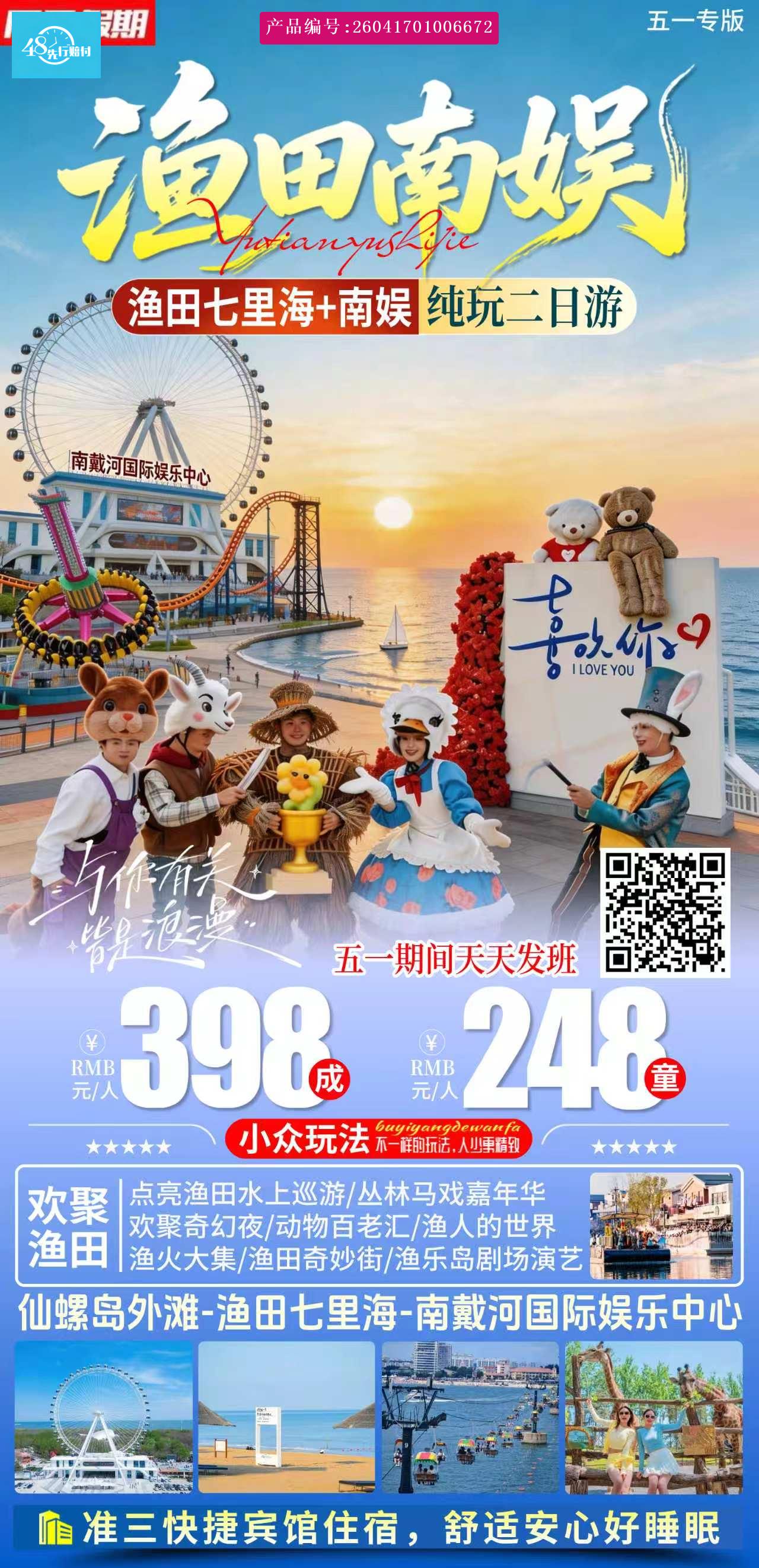 早指定时间地点乘车赴美丽的【秦皇岛】, [p] 午餐后 前往网红打卡地仙螺岛外滩【约2小时】,是依据民间海螺仙子的美丽传说而建,该岛由1038米的网红跨海索道连接岛屿海岸。网红打卡海滩犹如一串多彩的珍珠镶嵌在渤海之滨,辉映着这座美丽的海滨城市,南戴河沙子颗粒细小,风平浪静,沙软潮平,尽情的享受与大海的亲密接触。 [br] [/p] [p]游览【渔田·七里海度假区】(门票180/人已含),是秦皇岛首个“日游+夜游”双模式综合旅游度假区。度假区打造6大场景区域、9大剧场精彩演艺。奇思妙想的情景化设计、生动的故事演绎、动物主题化演艺巧妙融合,串联起一个充满欢乐的奇想世界。全新打造的超百场风格迥异、脑洞大开的演艺节目,融合了动物、演员、声光科技、主题场景等各种元素,为观众呈现一个超脱现实的童话世界 [br] [/p] [p]1、【点亮渔田】童话星河之上的大型水上巡游 [br] [/p] [p]邀请洛杉矶奥运会闭幕式总导演及迪士尼御用导演丹尼尔・斯蒂芬・弗兰纳里全新策划,再现世界经典童话,从《小美人鱼》的海底世界到《灰姑娘》的皇家舞会,从《阿拉丁》的神灯冒险到《彼得·潘》的童真守护……八艘主题花船载着童话主角灵动闪现,光影交织,碧波化作流动星河。当点灯人点亮第一缕星火,星河灯海便从河道蔓延至全岛。幻境之桥从水底浮起,径直通往平行时空的童话秘境。 [br] [/p] [p]2、【丛林马戏嘉年华】沉浸式户外马戏大狂欢 [br] [/p] [p]一场颠覆想象的奇幻马戏震撼登场,以经典马戏为核心,融合多种动物元素。走钢丝、大跳板等极限杂技轮番炸场,浮台高空跳水全国首秀惊艳亮相。马戏中场巡游队伍穿行观演席,与欢乐零距离。小丑诙谐逗趣与你互动,笑点与惊喜全程在线,打造一场多维度的沉浸式户外互动体验,让狂欢与奇幻触手可及! [br] [/p] [p]3、【欢聚奇幻夜(万人大合唱)】星空下的欢聚盛宴 [br] [/p] [p]星空笼罩着庆典花园,和家人朋友欢聚于此。以音乐舞蹈秀动感开场,当公仔DJ踩着节拍跃上舞台,带着万人在星空下浪漫合唱;童话精灵、奇幻角色惊喜现身,迎着万人合唱的声音唤醒深藏心底的悸动,舞台上水火交织,非遗打铁花在花园上空化作璀璨星辰,与倾泻铺展的烟花瀑布交织成梦幻奇境。这一刻,所有人都是童话主角! [br] [/p] [p]4、【动物百老汇】百鸟齐飞 动物大狂欢 [br] [/p] [p]一场关于动物与飞鸟主题的自然科普,汇聚十余种、百余只珍稀动物,食草动物结队出行、百鸟临岸齐飞、白鹈鹅吃鱼、黑耳鸢空中盘旋、骆驼、牦牛、小鹿在草地上漫步,好似一场动物大迁徙。在这里人与动物、与自然和谐共处,共同绘制一幅自然生态之景。 [br] [/p] [p]5、【渔人的世界】大型水上实景演出 [br] [/p] [p]夜晚降临,一场神秘之旅在拾光剧场拉开帷幕,和讲述者一起探索古老而神秘的渔人传说,游船、激光、水幕、烟雾串联,讲述光怪陆离的故事,重现“渔田理想国”。 [br] [/p] [p]6、【海上奇遇记】一场乘船入梦的奇幻之旅 [br] [/p] [p]一场乘船入梦的沉浸故事在沿岸上演,“水波渔舟”、“遇见美人鱼”、“熊族出没”等超10种主题场景,串联起“渔田与大海”、“现实与梦境”的奇幻故事。 [br] [/p] [p]7、【渔火大集】童话主角带你坠入童话绮梦世界 [br] [/p] [p]【渔火大集】《童话村NPC互动》 [br] [/p] [p]【渔火大集】《童话村开场舞》 [br] [/p] [p]8、【渔乐岛剧场演艺】 [br] [/p] [p]5大场景6大剧场 昼夜织梦 好戏不打烊 [br] [/p] [p]【渔火剧场】《恶龙出没之勇敢者》 [br] [/p] [p]【谷堆剧场】《稻草人和他的朋友们》 [br] [/p] [p]【水豚森友会】治愈系动物家园 自然探索乌托邦 [br] [/p] [p]【豚豚生日会】和水豚亲密互动 [br] [/p] [p]9、【渔田奇妙街剧场演艺】 [br] [/p] [p]奇妙街三大剧场 走进奇幻动物王国 [br] [/p] [p]【星辰剧场】《昆虫王国乱打秀》 [br] [/p] [p]【魔法剧场】《爱丽丝魔法奇遇》 [br] [/p] [p]【深海剧场】《章鱼博士的秘密实验基地》 [br] [/p] [p]结束后,安排入住。 [br] [/p]