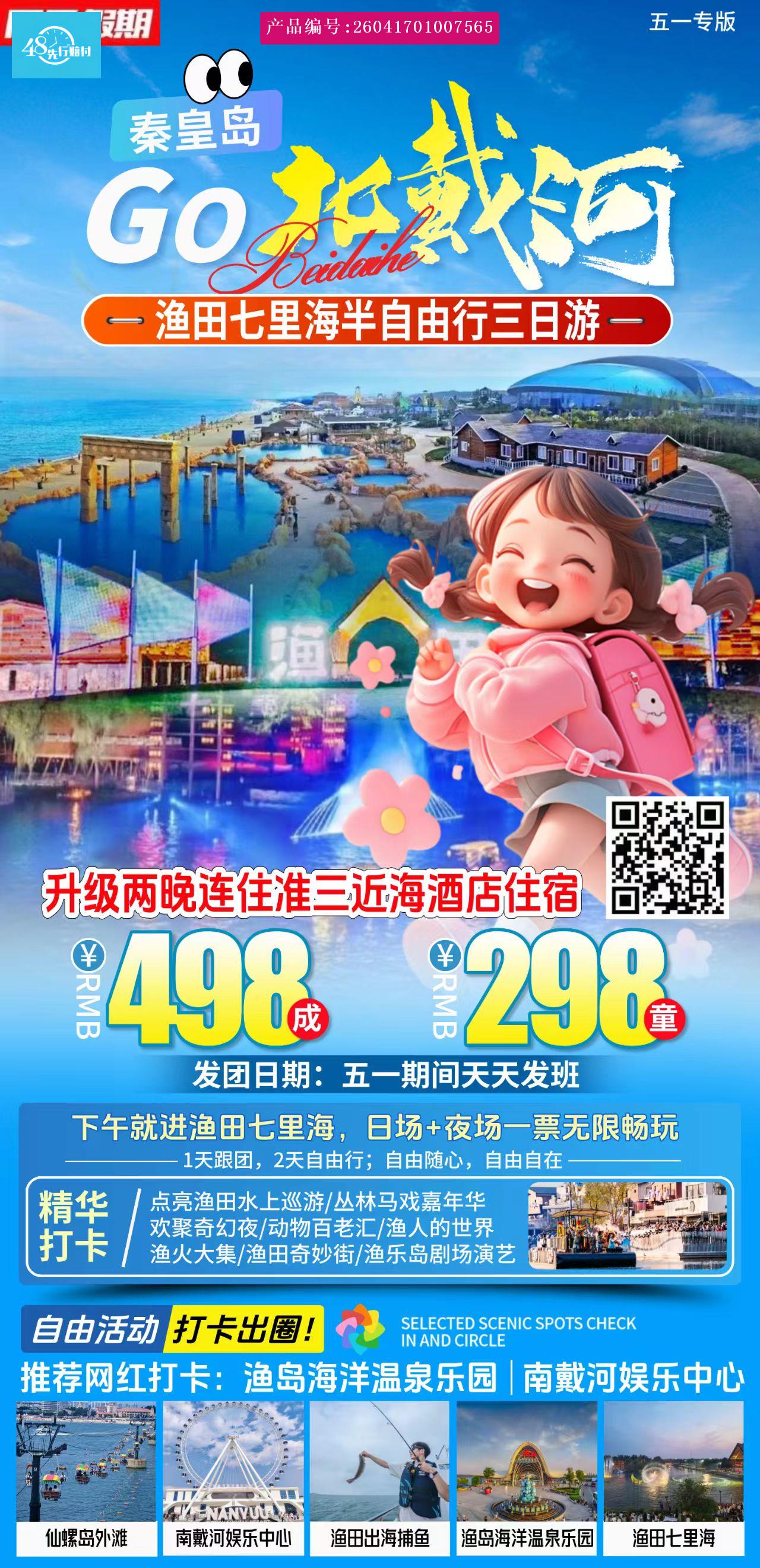 早指定时间地点乘车赴美丽的【秦皇岛】, [p]【乘船出海】(自理120元/人)乘坐帆船出海观光,让您零距离亲近大海,欣赏最美的渤海湾海上景色,与海鸥零距离接触,拍出属于您的海上抖音短视频。 [br] [/p] [p]后前往游览【渔田·七里海度假区】(门票180/人已含),是秦皇岛首个“日游+夜游”双模式综合旅游度假区。渔田七里海度假区位于秦皇岛市北戴河新区,紧邻世界自然遗产提名地七里海潟湖湿地。作为AAAA级旅游景区,渔田总占地约2400亩,总投资近45亿,定位为一站式全家度假目的地,集百场动物主题演艺、自然生态场景游乐项目、长颈鹿、狐猴、斑马主题度假酒店和36种不同风格的院落主题酒店、演艺互动商街于一体,涵盖“吃住行、游购娱”,致力打造中国自然生态一站式全家度假第一品牌。 [br] [/p] [p]1、【点亮渔田】童话星河之上的大型水上巡游 [br] [/p] [p]邀请洛杉矶奥运会闭幕式总导演及迪士尼御用导演丹尼尔・斯蒂芬・弗兰纳里全新策划,再现世界经典童话,从《小美人鱼》的海底世界到《灰姑娘》的皇家舞会,从《阿拉丁》的神灯冒险到《彼得·潘》的童真守护……八艘主题花船载着童话主角灵动闪现,光影交织,碧波化作流动星河。当点灯人点亮第一缕星火,星河灯海便从河道蔓延至全岛。幻境之桥从水底浮起,径直通往平行时空的童话秘境。 [br] [/p] [p]2、【丛林马戏嘉年华】沉浸式户外马戏大狂欢 [br] [/p] [p]一场颠覆想象的奇幻马戏震撼登场,以经典马戏为核心,融合多种动物元素。走钢丝、大跳板等极限杂技轮番炸场,浮台高空跳水全国首秀惊艳亮相。马戏中场巡游队伍穿行观演席,与欢乐零距离。小丑诙谐逗趣与你互动,笑点与惊喜全程在线,打造一场多维度的沉浸式户外互动体验,让狂欢与奇幻触手可及! [br] [/p] [p]3、【欢聚奇幻夜(万人大合唱)】星空下的欢聚盛宴 [br] [/p] [p]星空笼罩着庆典花园,和家人朋友欢聚于此。以音乐舞蹈秀动感开场,当公仔DJ踩着节拍跃上舞台,带着万人在星空下浪漫合唱;童话精灵、奇幻角色惊喜现身,迎着万人合唱的声音唤醒深藏心底的悸动,舞台上水火交织,非遗打铁花在花园上空化作璀璨星辰,与倾泻铺展的烟花瀑布交织成梦幻奇境。这一刻,所有人都是童话主角! [br] [/p] [p]4、【动物百老汇】百鸟齐飞 动物大狂欢 [br] [/p] [p]一场关于动物与飞鸟主题的自然科普,汇聚十余种、百余只珍稀动物,食草动物结队出行、百鸟临岸齐飞、白鹈鹅吃鱼、黑耳鸢空中盘旋、骆驼、牦牛、小鹿在草地上漫步,好似一场动物大迁徙。在这里人与动物、与自然和谐共处,共同绘制一幅自然生态之景。 [br] [/p] [p]5、【渔人的世界】大型水上实景演出 [br] [/p] [p]夜晚降临,一场神秘之旅在拾光剧场拉开帷幕,和讲述者一起探索古老而神秘的渔人传说,游船、激光、水幕、烟雾串联,讲述光怪陆离的故事,重现“渔田理想国”。 [br] [/p] [p]6、【海上奇遇记】一场乘船入梦的奇幻之旅 [br] [/p] [p]一场乘船入梦的沉浸故事在沿岸上演,“水波渔舟”、“遇见美人鱼”、“熊族出没”等超10种主题场景,串联起“渔田与大海”、“现实与梦境”的奇幻故事。 [br] [/p] [p]7、【渔火大集】童话主角带你坠入童话绮梦世界 [br] [/p] [p]【渔火大集】《童话村NPC互动》 [br] [/p] [p]【渔火大集】《童话村开场舞》 [br] [/p] [p]8、【渔乐岛剧场演艺】 [br] [/p] [p]5大场景6大剧场 昼夜织梦 好戏不打烊 [br] [/p] [p]【渔火剧场】《恶龙出没之勇敢者》 [br] [/p] [p]【谷堆剧场】《稻草人和他的朋友们》 [br] [/p] [p]【水豚森友会】治愈系动物家园 自然探索乌托邦 [br] [/p] [p]【豚豚生日会】和水豚亲密互动 [br] [/p] [p]9、【渔田奇妙街剧场演艺】 [br] [/p] [p]奇妙街三大剧场 走进奇幻动物王国 [br] [/p] [p]【星辰剧场】《昆虫王国乱打秀》 [br] [/p] [p]【魔法剧场】《爱丽丝魔法奇遇》 [br] [/p] [p]【深海剧场】《章鱼博士的秘密实验基地》 [br] [/p] [p]结束后,安排入住。 [br] [/p]
