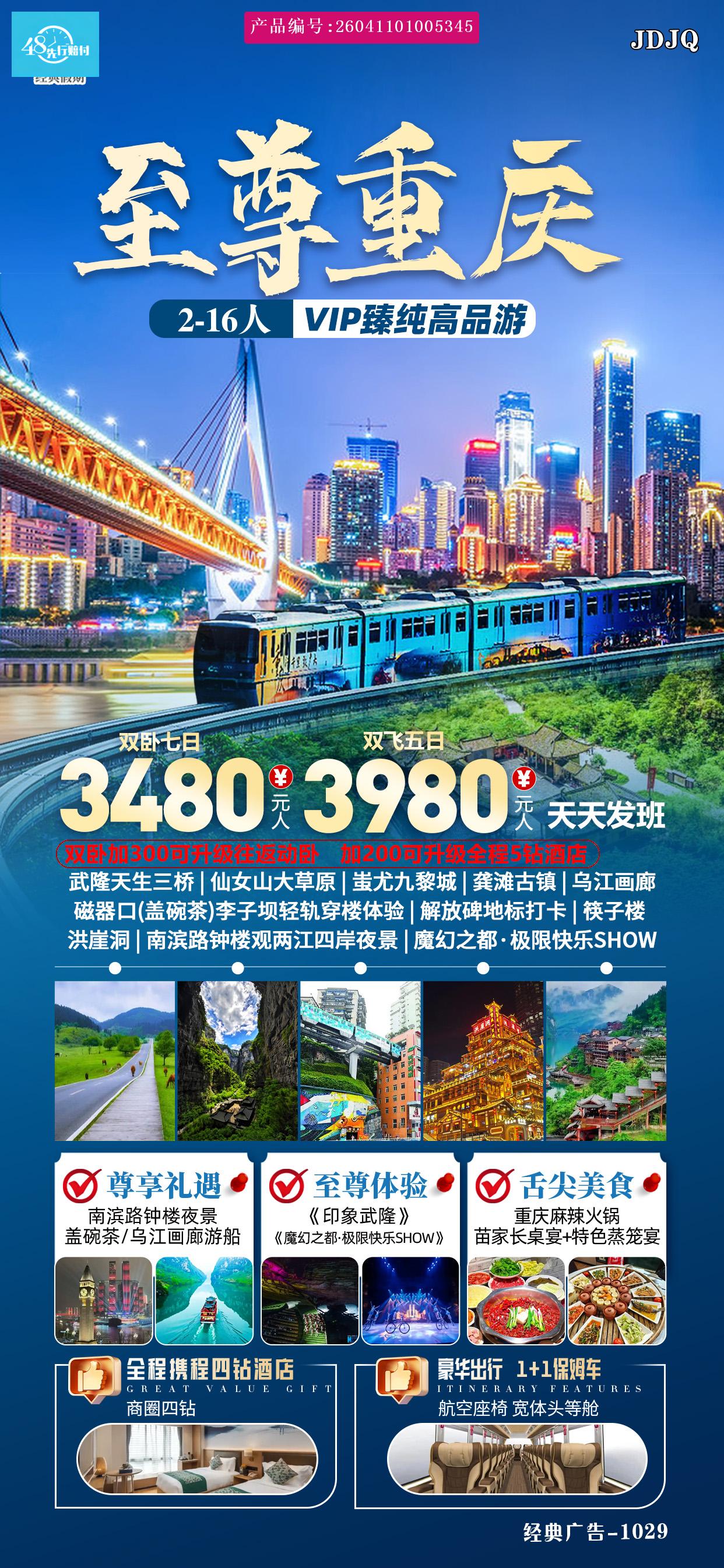 [p] [br] [/p] [p]用车含:陆地 1+1 航空旅游巴士,车型不定,确保一人一个正座。本产品是 2-16 人小团,6 人(含)以上用 1+1车,6 人以下用相对应的车型。 [br] [/p] [p]接送机场为专业接送车辆,拼车接送,不配导游(红旗轿车接送站,若人数超过4人需要一台车接站请提前告知此情况我社会根据具体人数采用相对应商务车接送) [br] [/p] [p]北京往返重庆飞机经济舱(高铁二等座)门票含:天生三桥、仙女山森林公园、印象武隆、蚩尤九黎城、龚滩古镇古维费、乌江画廊游船,大型幻境杂技剧《长江》 1 张/人(所有门票价格均按优惠核算,凡持优惠证件、免票证件以及享受优惠政策游客均不享受优惠。)住宿4钻:融景酒店鸿恩寺公园店/橙际酒店冉家坝店/泊尊云镜/融汇季晚/高悦酒店观音桥店/重滨云涯/渝舍/伊美/桔子(重庆观音桥步行街中心店)+武隆大卫营/云海/瑜珠花园 [br] [/p] [p]5钻:重庆保利花园皇冠假日/融汇国际/威灵顿+武隆中科依云/荣融金科/城际 [br] [/p] [p]报价均以1人1个床位计价,如游客人数为单数而又无法拼房,则需要补房差;敬请理解。 [br] [/p] [p]用餐含:占床者--含餐 4 早 3 正餐 [br] [/p] [p]l 特别说明:行程标注的早餐为酒店所含餐,早餐为酒店含早赠送。 [br] [/p] [p]l 行程所列用餐不用不退任何费用。 [br] [/p] [p]导游含:行程内持证中文导游服务。2 人(含)以上安排导游。 [br] [/p] [p]l 行程内导游会以同团大部分旅游者作为照顾对象,如需按照自已意愿游览,或不按规定时间安排的,为避免同团其它旅游者造成不满,我社不作任何特殊安排。保险含:旅行社责任险,建议游客购买旅游意外险(最高赔偿额不超过 10 万,最终解释权归保险公司所有)儿童1.2 米以下儿童:只含行程往返汽车车位、半餐、导游服务,其余均自理; [br] [/p]l 超过1.2米以上按成人操作,无任何优惠可退。赠送行程所列项目因任何原因不参加,费用一律不退,也不换等价项目。