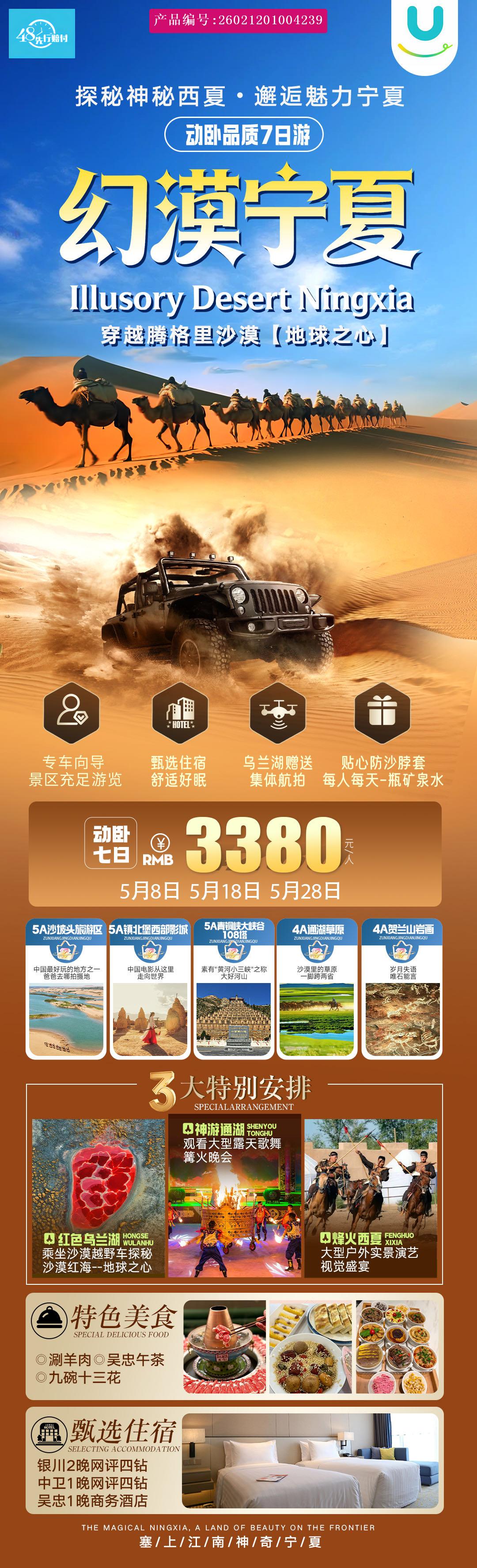 1、用餐:含 5 早 9 正(早餐为酒店团队房价包含,为酒店配送,不吃不退、精心安排 3 大特色餐:涮羊肉、九碗十 [p]三花、吴忠午茶) [br] [/p] [p]■西北地区用餐口味以及餐质可能和其他地区不同,不习惯者请提前自备佐食, 因整体餐费不以个人用餐与否减少, [br] [/p] [p]自愿放弃用餐无费用可退,敬请谅解。用餐后的休息时间属自由活动时间,请注意个人财产以及人身安全。 [br] [/p] [p]2、交通:北京-银川往返动卧,请报名时核对准确信息。如因客人提供信息有误,所产生损失由客人自行承担),当 [br] [/p] [p]地全程当地旅游车,保证一人一座; [br] [/p] [p]3、住宿:全程 3 晚四钻+1 晚当地四星(吴忠因条件所限,安排商务宾馆) [br] [/p] [p]■旅行社将根据实际情况安排游客入住。不提供自然单间,如产生单人房差请游客自行现付房差。单房旅游旺季和节 [br] [/p] [p]假日期间, 由于房源紧张,旅行社可能会安排其他的不低于以上住宿标准的住房 [br] [/p] [p]■因旅游者主观要求标准不同,酒店未达到个人住宿要求标准的不属于旅游行程质量范畴。遇特殊原因(如天气,交 [br] [/p] [p]通,地面) ,酒店接待能力,可能变更住宿地点,标准不变。 [br] [/p] [p]■备注:西北属偏远、发展中地区,住宿条件相对较一般,条件有限,不能和内陆城市的同等级酒店相比,还请请客 [br] [/p] [p]人多谅解、包涵。 [br] [/p] [p]4、门票:含行程所列景点大门票(按 60 岁以上核算) ,行程中所含的所有景点门票已按旅行社打包价核算,故客 [br] [/p] [p]人持有军官证、残疾证、老年证等优惠证件及其他特殊身份人士,无门票退还(60 岁以下补门票 200 元/人)。 [br] [/p] [p]5、导游:地接中文导游服务,全程导游陪同服务; [br] [/p] [p]6、保险:旅行社责任险,建议自行购买旅游意外险; [br] [/p] [p]7、儿童:儿童 1.2 米以下的报价含车费、导服费、半价餐费,不含景点门票、不含床位费(早餐费用现付),如超 [br] [/p] [p]高产生门票及其他费用由家长现付;小孩请携带户口簿原件或身份证原件; [br] [/p] [p] [br] [/p]