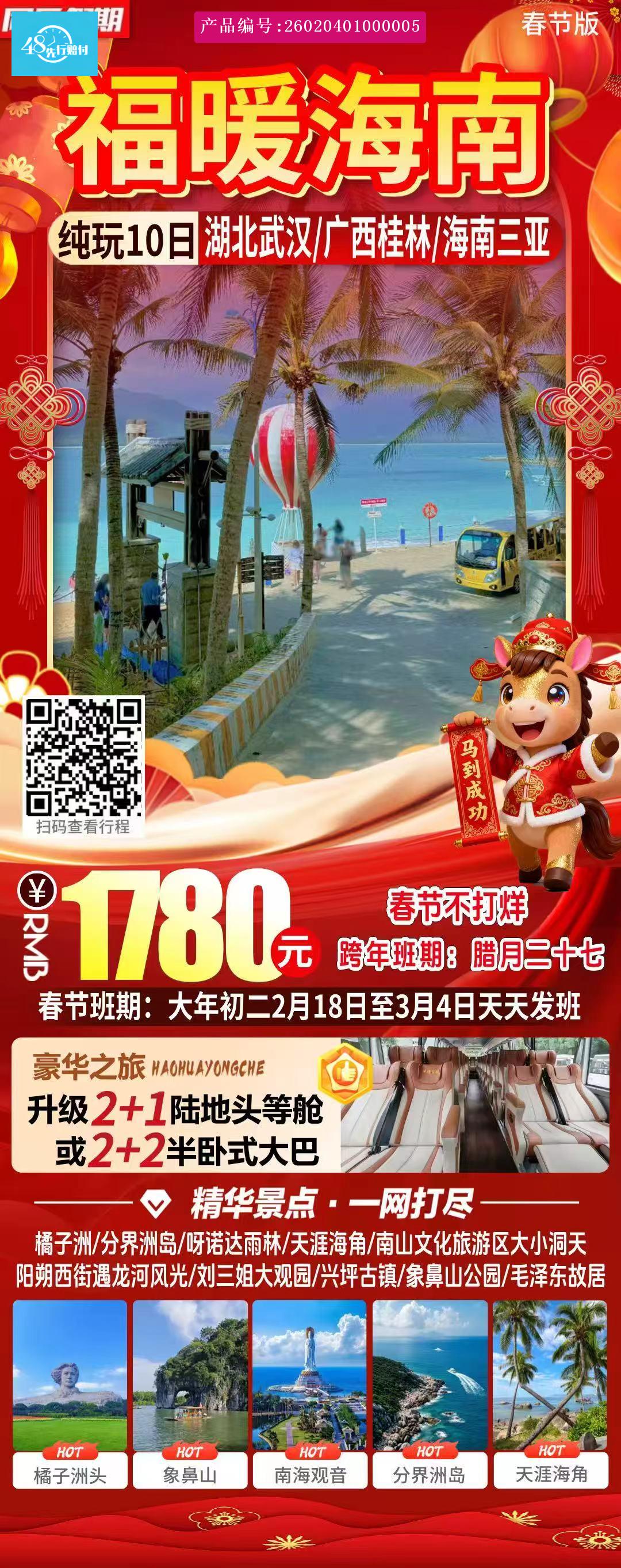 [p]必消项目:9晚住宿+综合服务费=698元/人(必消参团视为接受,上车现付导游) [br] [/p] [p]船票小交通自理项目: [br] [/p] [p]★分界洲船费+服务费自理130元/人 [br] [/p] [p]★徐闻港往返海口轮渡自理83元/人 [br] [/p] [p]★亚龙湾玫瑰谷电瓶车自理30元/人 [br] [/p] [p]★韶山往返环保车20元/人 [br] [/p] [p]★橘子洲往返电瓶车40元/人 [br] [/p] [p]自费:三亚段红色娘子军演出260元/人或夜游三亚湾238元/人或凤凰岭索道98元/人 [br] [/p] [p]备 注:1.2米以下儿童只含车费、导服、半餐。1.2米以上同成人。 [br] [/p] [p]接待说明:【游客参团前应如实告知身体健康情况及患病史,在确定身体健康能够出行的情况下方可参团(高血压,糖尿病等有基础病的不收);如65岁以上客人参团,须由家人子女在了解行程后,在确保参团者身体健康的情况下方可签合同参团,并确保至少有一名身体健康、年龄在18-65岁间家人陪同照顾;未成年人需由监护人陪同方可参团,以上情况不如实相告或隐瞒身体状况的出现任何事与旅行社无关,游客自己承担后果与损失】临时离团需签自愿离团协议,免责协议,交离团费600元/人! [br] [/p] [p] [/p]