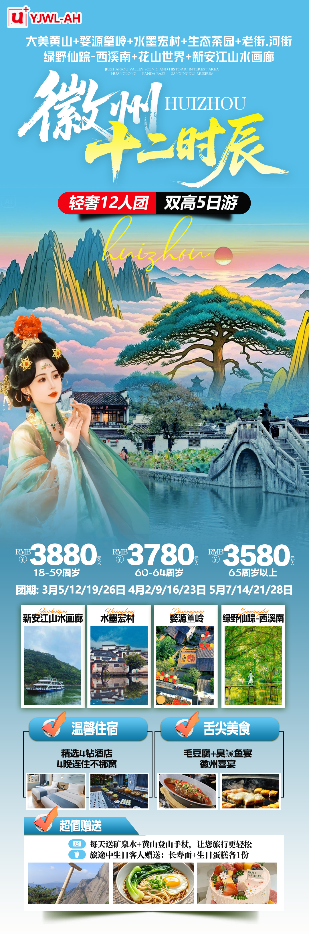 [p]一、旅游服务标准:住宿①、黄山市区精选4钻酒店或挂牌四星,四晚连住不挪窝。【2人1标,单人需补房差】 [br] [/p] [p]②、黄山市为山区旅游城市,酒店等级相比一二线城市会有落差,请提前告知客人; [br] [/p] [p]携程4钻酒店或挂牌四星酒店,以实际安排为准: [br] [/p] [p]安持华府、华山宾馆、天都国际、徽商国际、徽风皖韵、蝶尚兰花、丽呈别院或同标准用餐①、行程含4早4正餐【山下正餐40元/人,4人以下退餐费,5人(五菜一汤),6-7人(六菜一汤),8-9人(八菜一汤),9-10人(九菜一汤),11-12人(十菜一汤),其他正餐自理】 [br] [/p] [p]②、升级“舌尖徽州”特色美食——【毛豆腐+臭鳜鱼宴】、【徽州喜宴】。 [br] [/p] [p]③、在黄山旅行日期中,有过生日的客人赠送:长寿面+生日蛋糕各1份。车费当地空调旅游车,根据参团人数安排不同车型; [br] [/p] [p]【2-3人按小轿车,4-6人按7-9座车,6-10人按14座车,11-12人按18座车】门票行程中所列景点首道大门票; 【园中园门票均自理】小交通黄山景区环保车,西溪南电瓶车,新安江游船;导游①、黄山专业导游讲解服务,全程一车一导,中途不换导游; [br] [/p] [p]②、另第一天由司机负责接站、自由活动期间无导游服务;购物①、此团全程纯玩,无安排常规购物店,尽享品质旅行; [br] [/p] [p]②、行程中茶叶博物馆、屯溪老街.河街,均为参观景点,敬请配合。小童①、小童1.2M以下/不占床/无早餐:只含4正餐+车位费+导服+换乘小交通; [br] [/p] [p]【如超高需补门票差价:黄山95+宏村52+花山世界50+新安江80=277元/位】 [br] [/p] [p]②、1.2M至18周岁以下/占床:含半价优惠门票,其他按成人操作;老者①、60-64周岁老年人,含半价门票优惠(黄山/宏村/花山世界),其他按成人操作; [br] [/p] [p]②、65周岁以上老年人,含免大门票优惠(黄山/宏村/花山世界),其他按成人操作;保险本公司已购买旅行社责任险,理赔以保险条例为准,建议另外购买旅游意外险。 [/p]
