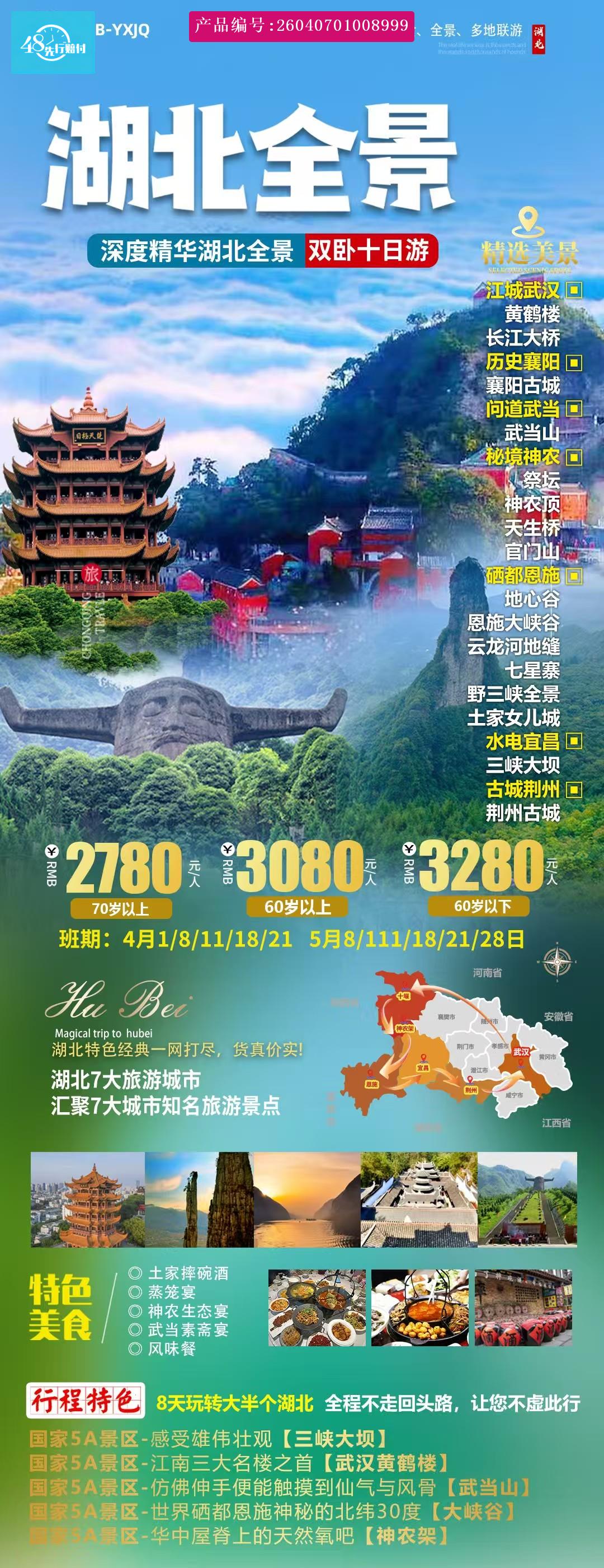1.当地必消699元/人=武当山环保车+神农顶环保车+地心谷景交车+恩施大峡谷地面缆车+恩施大峡谷景交车+三峡大坝换乘车+清江船费+升级特色餐+综合服务费(当地现付给导游,报名参加此行程即表示认可本必消套餐) [p]2:自愿自费: [/p] [p] [p]1.武汉段:黄鹤楼电瓶车10元/人(自愿自理)。 [br] [/p] [p]2.武当山段:武当山往返索道170元/人(自愿消费、建议乘坐),单程上行索道90元/人(自愿消费、建议乘坐),单程下行索道80元/人(自愿消费、建议乘坐); [br] [/p] [p]3.恩施段:恩施大峡谷上行索道105元/人(自愿自理、建议乘坐),七星寨下行扶梯30元/人(自愿自理),地缝小蛮腰垂直电梯30元/人(自愿自理);云顶(黄鹤峰林)上行索道40元/人(自愿自理),云顶(黄鹤峰林)上行电梯30元/人(自愿自理),云顶仙台128元/人(自愿自理);地心谷垂直电梯30元/人(自愿自理),地心谷玻璃桥60元/人(自愿自理),地心奇航60元/人(自愿自理),悬崖列车80元/人(自愿自理);西兰卡普民俗表演(自愿自理)。 [br] [/p] [p]4.宜昌段:三峡大坝电瓶车10元/人(自愿自理),三峡大坝耳麦20元/人(自愿自理)。 [br] [/p] [p]5.神农架段:无二消。6.荆州段:荆州古城上城墙(宾阳楼)35元/人(自愿自理),环城电瓶车50元/人(自愿自理)。 [br] [/p] [/p]
