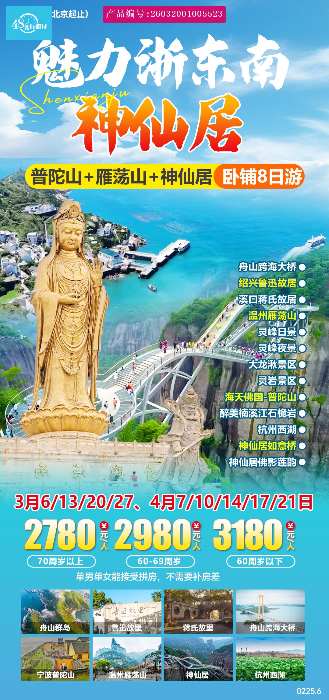 ◆早餐后赴中国最大群岛〖舟山群岛〗,经世界之最“舟山跨海大桥”,抵达朱家尖码头, [p]乘船前往海天佛国【普陀山】(包含门票160元,往返船票60自理付导游) [br] [/p] [p]普陀山地形呈菱形状,是舟山群岛1390个岛屿中的一个小岛,形如苍龙卧海,面积12.52平方千米,素有“海天佛国”、“南海圣境”之称,参观普陀第一大寺【普济寺】(约1小时),普陀山露天大佛【南海观音】(约1小时),观音修道之所【不肯去观音院】(约1小时),海滨沙滩【百步沙】(约30分钟), [br] [/p] [p]然后乘船返回宁波。 [br] [/p] [p]提示:景交和小门票自愿自理:景交3段15元,普济寺5元(70岁以上免费)、南海观音6元(70岁以上免费) [br] [/p]