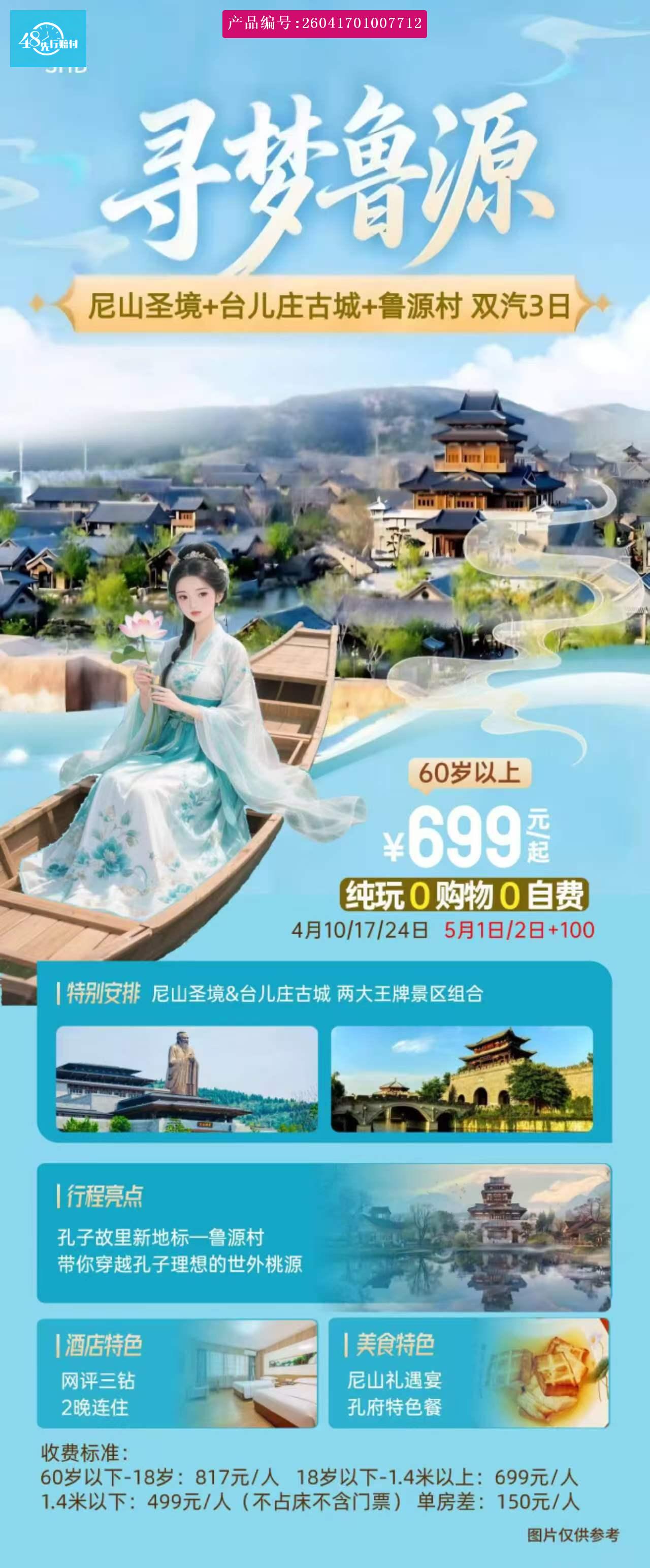 [p]一、费用包含: [br] [/p] [p]◇交通:含全程空调旅游车位(如报名后放弃出游或中途离团,车位不退); [br] [/p] [p]◇门票:行程中的景点首道门票;游客在享受本报价的门票优惠及自费项目的联票优惠后,不重复享受景区的门 [br] [/p] [p]票优惠政策。注:60 岁以下台儿庄古城门票 118 元/人自理(需报名时交!) [br] [/p] [p]◇住宿:当地商务酒店 2 晚,标间独卫,保证每人一床位;不安排自然单间,单男单女需补房差 [br] [/p] [p]◇餐饮:2 早 2 正(酒店含早、正餐十人一桌八菜一汤,不足十人菜量酌减,不含酒水,不吃不退) [br] [/p] [p]◇服务:当地优秀导游服务; [br] [/p] [p]◇儿童:1.2 米以下儿童,包含全程车位、餐费、导服,超高产生其他费用须自理。 [br] [/p] [p]◇购物:全程 0 购物 [br] [/p] [p]◇自费:全程 0 自费(演出及景交除外) [br] [/p] [p] [br] [/p] [p] [br] [/p]