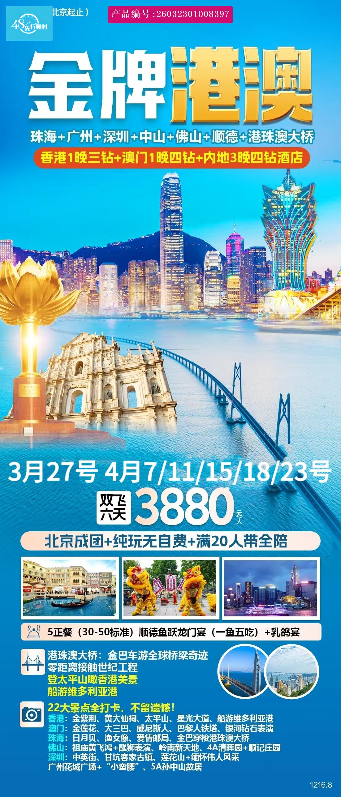 [p]【交通】北京-广东 (珠海/佛山/深圳/广州/惠州等城市, 以实际出票为准) 往返团队经济舱, 特价票不签不 改不退! [br] [/p] [p]【用车】全程正规空调旅游大巴车 (1人1正座, 自由活动期间不含) [br] [/p] [p]【用餐】 3自助早餐 (香港澳门酒店不含早餐, 安排简易打包早或者自行享当地早餐) 5正餐 =50*3正餐+30-40正餐: 顺德鱼跃龙门宴 (一鱼五吃) +乳鸽宴 [br] [/p] [p]【景点】行程所列景点大门票。如景区/景点没有游览, 不涉及退费 【住宿】香港1晚三钻+澳门1晚四钻酒店+内地三晚四钻酒店 [br] [/p] [p]温馨提示: 香港/澳门的酒店多为美式, 房间面积偏小, 请自行携带牙膏/牙刷/拖鞋等个人卫生用品, 酒店房间 [br] [/p]内小冰箱里的食物、座机拨打电话等都是需要付费的, 请不要将榴莲等有强烈气味的水果带入酒店使用。 [p]【导游】持证优秀国语导游服务 (团队不足10人的改由司兼导, 正餐按退餐费处理) [/p]