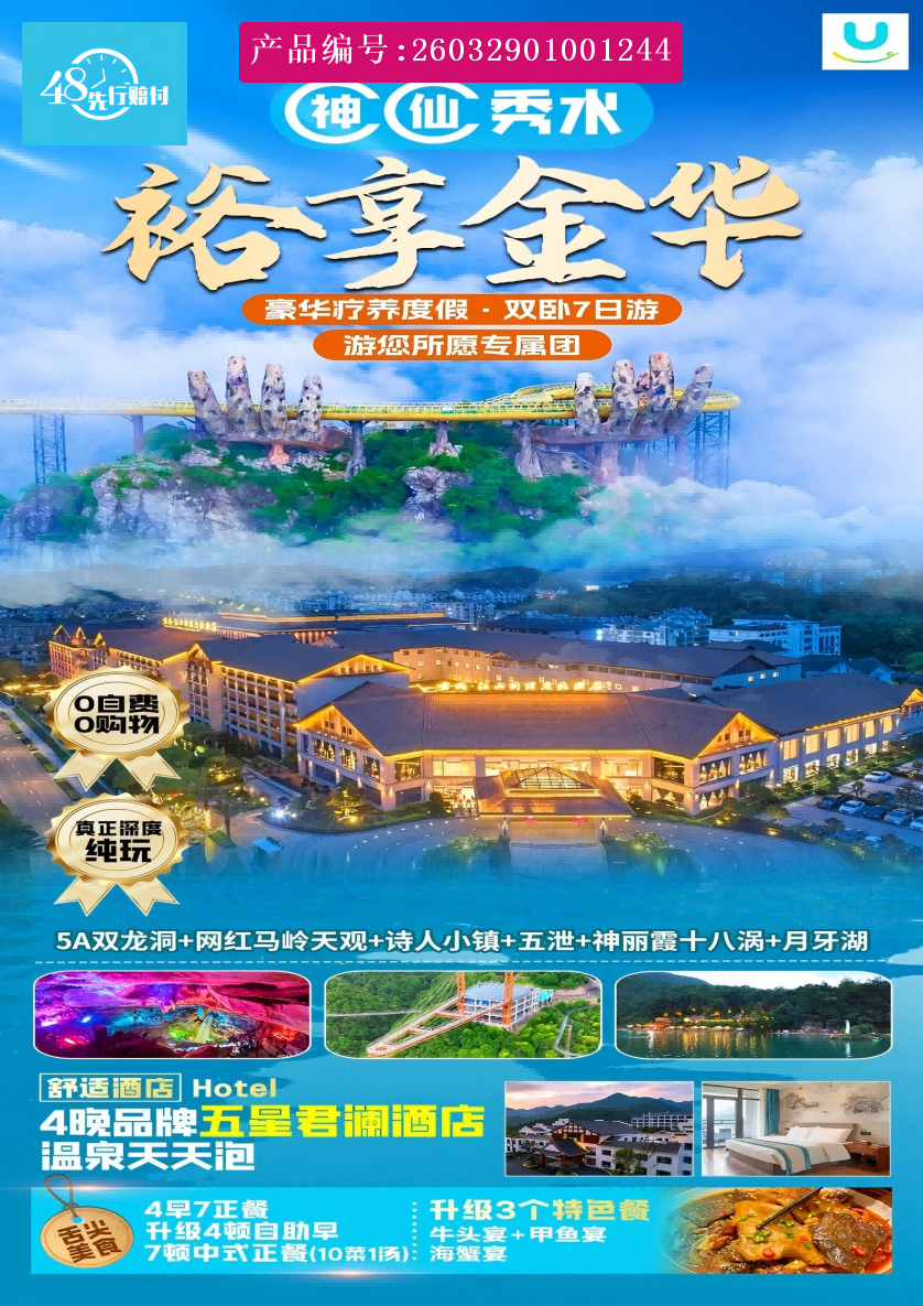 乘坐火车抵达黄山高铁站,导游接团 ,一路欢声笑语 ,沿途欣赏祖国大好河山 ,前往游玩网红【马岭天观佛手景区】(大门票+天空之境赠送 ,云梯自理 80 元/人 ,报名时请知悉! 自愿自理 ,绝不强制;任何证件无优惠 ,敬请知晓! ),(车程约3小时 ,游览约 3 小时)马岭天观佛手桥:一双巨大的手由山中伸出 ,托起一座金色的桥 ,震撼级的美景!横亘建德、桐庐、浦江三地交界的崇山峻岭之中 ,人称“马岭天观”。重峦叠嶂如玉龙蜿蜒 ,悬崖峭壁如宝剑斫伐 ,擎天石柱横空出世 ,伫立于群山之巅 ,马岭古道横列于巍峨群山之间 ,连接南北数十公里。该项目位于乾潭镇梓洲村 ,依拖一峰九崖、船冲石、 官财岩等优质奇石资源 ,建设刺激惊险类体验项目 ,营造充满冒险精神的惊叫体验氛围。游玩【新光村】(车程约20分钟 ,赠送游览 ,约 1小时):该村始祖灵岩公 ,于1735年前后 ,在杭州等地赚得大钱 ,富甲一方 ,号称朱百万。灵岩公等赈灾济贫、建桥修路、焚券免债等8000余金;创办灵岩免费学校 ,设立全县秀才奖励基金 ,华太公创办全县最早的徽班剧团 ,朱守公传说故事诙谐动听 ,名震华厦 ,该村当时称为浦江秀才的摇篮 ,浦江教育文化的次中心 ,并号称金华第一村。在廿九间里听、唱民谣 ,体会慢生活的乐趣。后游览【网红诗人小镇】(车程约20分钟 ,赠送游览 ,游览约 1 小时)位于浦江县大畈乡壶源江畔,因地形酷似古钱塘,素有“小杭州”之美誉。在这个诗意流淌的地方,沿溪而行,探访诗人小屋,漫步五彩花田 ,看古老的小桥流水呼吸百亩茶园的芬芳很是惬意。小镇里有七座厅堂 , [p]多座厅堂外墙门楣均嵌有‘大方伯’或‘方伯第’石匾 ,典雅精致 ,具有较高的观赏价值。此外 ,这里还有香樟大道、三潭印月、花港观鱼、广安桥、凌空栈道等景点。受瞩目的是古银杏树 ,许多人会来此许下美好心愿。入住酒店。 [br] [/p]