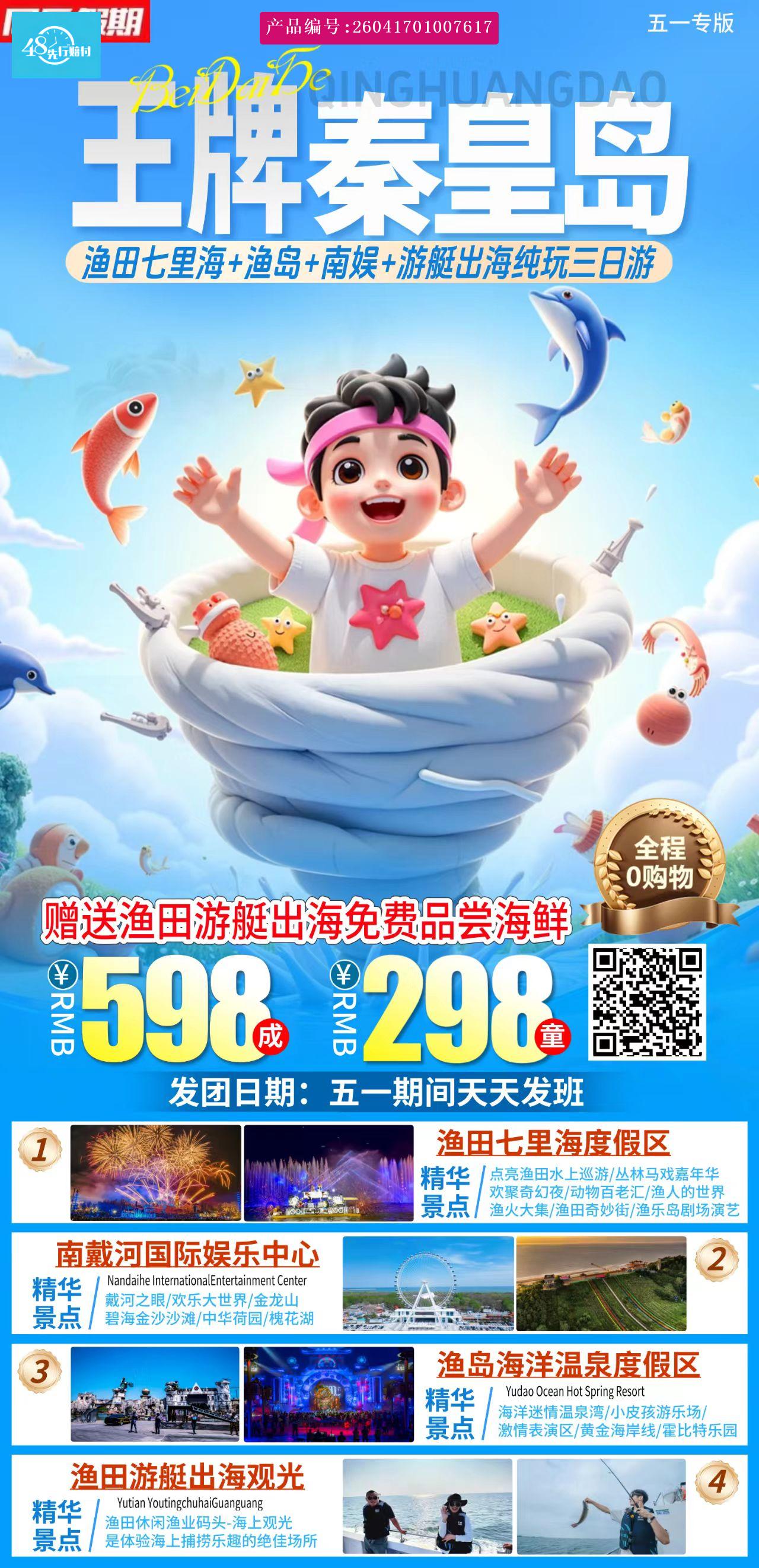 早指定时间地点乘车赴美丽的【秦皇岛】, [p]后前往游览【渔田·七里海度假区】(门票180/人已含),是秦皇岛首个“日游+夜游”双模式综合旅游度假区。渔田七里海度假区位于秦皇岛市北戴河新区,紧邻世界自然遗产提名地七里海潟湖湿地。作为AAAA级旅游景区,渔田总占地约2400亩,总投资近45亿,定位为一站式全家度假目的地,集百场动物主题演艺、自然生态场景游乐项目、长颈鹿、狐猴、斑马主题度假酒店和36种不同风格的院落主题酒店、演艺互动商街于一体,涵盖“吃住行、游购娱”,致力打造中国自然生态一站式全家度假第一品牌 [br] [/p] [p]1、【点亮渔田】童话星河之上的大型水上巡游 [br] [/p] [p]邀请洛杉矶奥运会闭幕式总导演及迪士尼御用导演丹尼尔・斯蒂芬・弗兰纳里全新策划,再现世界经典童话,从《小美人鱼》的海底世界到《灰姑娘》的皇家舞会,从《阿拉丁》的神灯冒险到《彼得·潘》的童真守护……八艘主题花船载着童话主角灵动闪现,光影交织,碧波化作流动星河。当点灯人点亮第一缕星火,星河灯海便从河道蔓延至全岛。幻境之桥从水底浮起,径直通往平行时空的童话秘境。 [br] [/p] [p]2、【丛林马戏嘉年华】沉浸式户外马戏大狂欢 [br] [/p] [p]一场颠覆想象的奇幻马戏震撼登场,以经典马戏为核心,融合多种动物元素。走钢丝、大跳板等极限杂技轮番炸场,浮台高空跳水全国首秀惊艳亮相。马戏中场巡游队伍穿行观演席,与欢乐零距离。小丑诙谐逗趣与你互动,笑点与惊喜全程在线,打造一场多维度的沉浸式户外互动体验,让狂欢与奇幻触手可及! [br] [/p] [p]3、【欢聚奇幻夜(万人大合唱)】星空下的欢聚盛宴 [br] [/p] [p]星空笼罩着庆典花园,和家人朋友欢聚于此。以音乐舞蹈秀动感开场,当公仔DJ踩着节拍跃上舞台,带着万人在星空下浪漫合唱;童话精灵、奇幻角色惊喜现身,迎着万人合唱的声音唤醒深藏心底的悸动,舞台上水火交织,非遗打铁花在花园上空化作璀璨星辰,与倾泻铺展的烟花瀑布交织成梦幻奇境。这一刻,所有人都是童话主角! [br] [/p] [p]4、【动物百老汇】百鸟齐飞 动物大狂欢 [br] [/p] [p]一场关于动物与飞鸟主题的自然科普,汇聚十余种、百余只珍稀动物,食草动物结队出行、百鸟临岸齐飞、白鹈鹅吃鱼、黑耳鸢空中盘旋、骆驼、牦牛、小鹿在草地上漫步,好似一场动物大迁徙。在这里人与动物、与自然和谐共处,共同绘制一幅自然生态之景。 [br] [/p] [p]5、【渔人的世界】大型水上实景演出 [br] [/p] [p]夜晚降临,一场神秘之旅在拾光剧场拉开帷幕,和讲述者一起探索古老而神秘的渔人传说,游船、激光、水幕、烟雾串联,讲述光怪陆离的故事,重现“渔田理想国”。 [br] [/p] [p]6、【海上奇遇记】一场乘船入梦的奇幻之旅 [br] [/p] [p]一场乘船入梦的沉浸故事在沿岸上演,“水波渔舟”、“遇见美人鱼”、“熊族出没”等超10种主题场景,串联起“渔田与大海”、“现实与梦境”的奇幻故事。 [br] [/p] [p]7、【渔火大集】童话主角带你坠入童话绮梦世界 [br] [/p] [p]【渔火大集】《童话村NPC互动》 [br] [/p] [p]【渔火大集】《童话村开场舞》 [br] [/p] [p]8、【渔乐岛剧场演艺】 [br] [/p] [p]5大场景6大剧场 昼夜织梦 好戏不打烊 [br] [/p] [p]【渔火剧场】《恶龙出没之勇敢者》 [br] [/p] [p]【谷堆剧场】《稻草人和他的朋友们》 [br] [/p] [p]【水豚森友会】治愈系动物家园 自然探索乌托邦 [br] [/p] [p]【豚豚生日会】和水豚亲密互动 [br] [/p] [p]9、【渔田奇妙街剧场演艺】 [br] [/p] [p]奇妙街三大剧场 走进奇幻动物王国 [br] [/p] [p]【星辰剧场】《昆虫王国乱打秀》 [br] [/p] [p]【魔法剧场】《爱丽丝魔法奇遇》 [br] [/p] [p]【深海剧场】《章鱼博士的秘密实验基地》 [br] [/p] [p]结束后,安排入住。 [br] [/p]