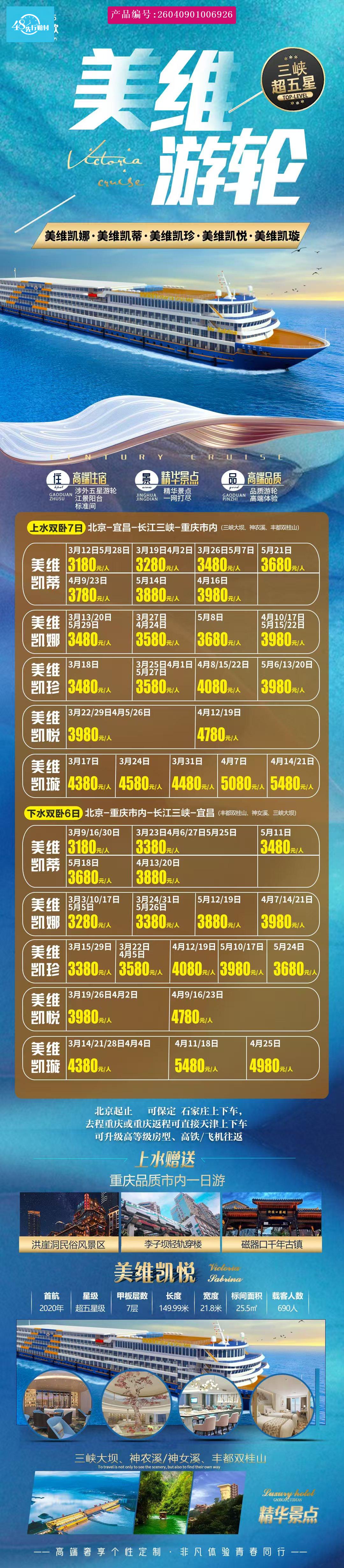 [p]1、船舱住宿:豪华游船阳台双人标准间、中央空调、彩电、24小时热水 独立卫生间),我公司不提供自然单间,单男单女可与游船上其他同性别男/女拼房合住、无需补单房差、如不愿意拼房、则需出发前补齐单间房差! [br] [/p] [p]2、餐饮标准:3早4正(游船:早中晚中西自助) [br] [/p] [p]3、旅游巴士:当地空调旅游车 [br] [/p] [p]4、往返交通:往返火车空调硬卧 [br] [/p] [p]5、导游服务:专业导游服务 [br] [/p] [p]6、景点门票:景点首道门票 (丰都双桂山、神女溪、三峡大坝) [br] [/p] [p]7、购物安排:如当天重庆地面赠送安排了重庆市内一日游,则会进土特产超市或者火锅底料生产车间,请您自选选择即可,绝无强制! [br] [/p] [p]8、游船小费:内宾自愿不强制,外宾小费随船票款一并提前支付给游船公司 [br] [/p]9:备注:游船上用餐和景点门票为游船打包价格,若客人自动放弃用餐及景点,费用均不退)10:游船住宿一般为2楼(游轮大堂)标准间的基础楼层,如客人指定楼层,每上升一层补150元/人