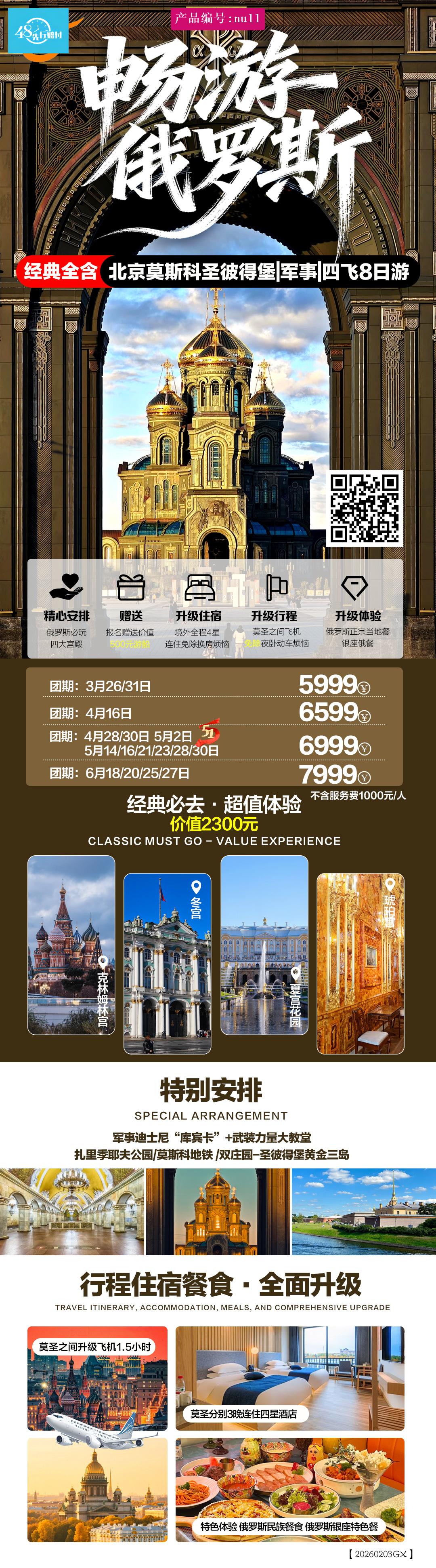 1. 机票北京/俄罗斯往返国际机票,以及莫斯科圣彼得堡之间往返机票,团队经济舱,含机场建设税(含托运行李,具体以航司公布为准); [p]2. 酒店俄罗斯当地四星级酒店(双人标准间)境外酒店都会有标准间、大床房、单人间等房型。会按酒店房间情况进行分配,如有造成不便之处敬请谅解; [/p] [p]3. 用车 境外进口旅游巴士及外籍司机,10 小时工作制,超时请付超时费; [/p] [p]4. 餐食 专职领队全程陪同,境外安排导游讲解; [/p] [p]5. 导服酒店内早餐,中式午晚餐(正餐八菜一汤,十人一桌。如一桌人数变化餐数量随之变化)+库兵卡简式俄餐,银座俄餐 1 次,团餐需要提前预定整团用餐,行程中如因客人自身原因不用餐,餐费不退。 [/p] [p]6. 门票克里姆林宫、库兵卡坦克博物馆、冬宫、夏宫花园、叶卡捷琳娜花园和宫殿,莫斯科游船(以上景点首道门票); [/p] [p]7. 签证俄罗斯免签、是否准予出入境,是有关部门的权力,如因游客自身原因,不准出入境而影响行程的,团队费用损失由游客自行承担; [/p] [p]8. 保险 双保险旅行社责任险以及意外险。 [/p]